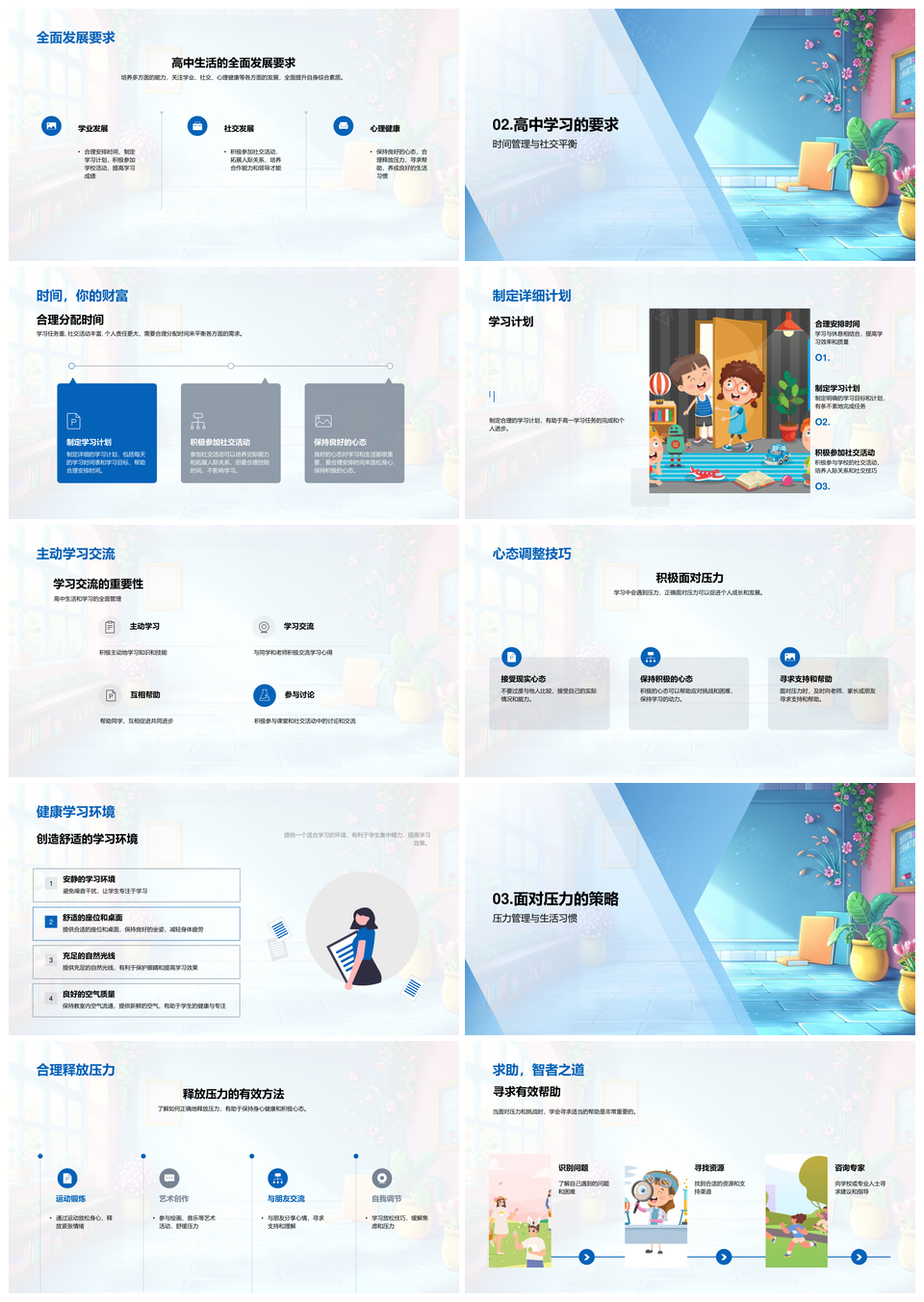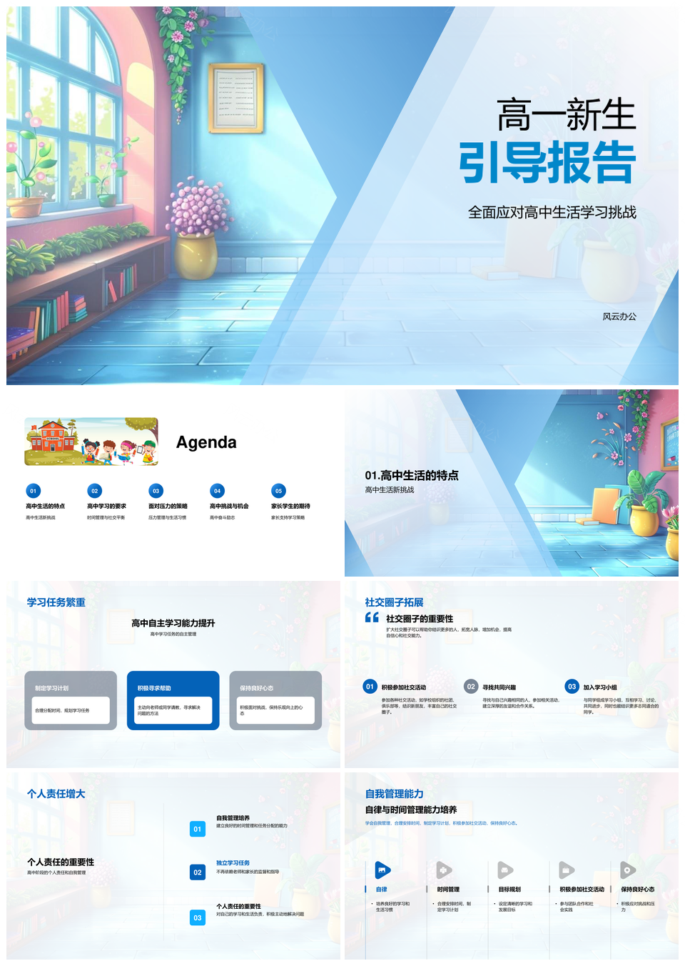 2025高中生独立学习节奏规律时间管理社团挑战生活态度学校背包指南PPT模板