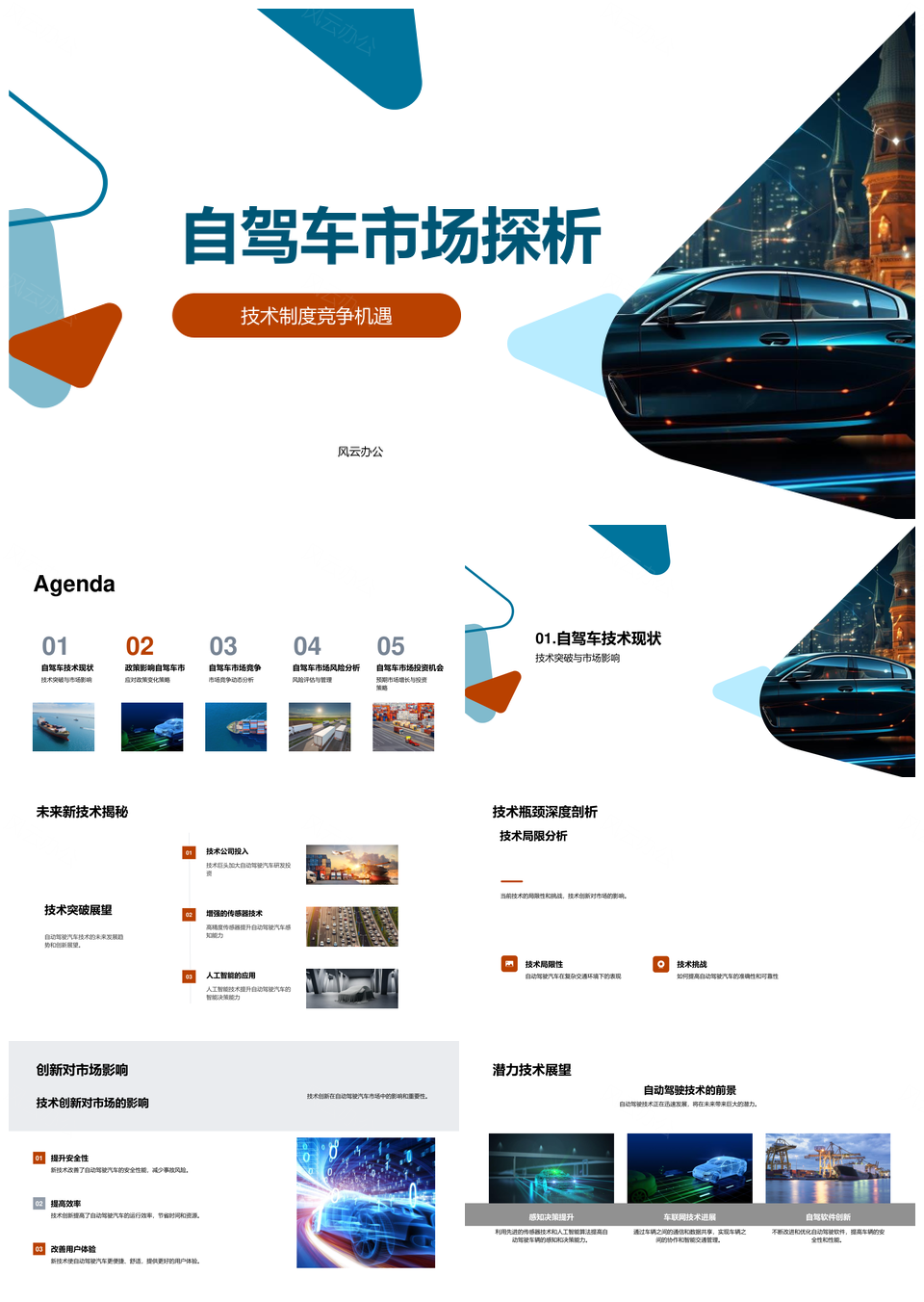 风云办公提供的自驾车市场技术竞争与投资机遇分析PPT模板,下载格式为pptx,一共33页,作品中文字及图均可以修改和编辑,图片更改请在作品中右键图片并更换,文字修改请直接点击文字进行修改。