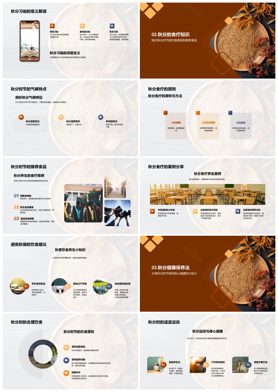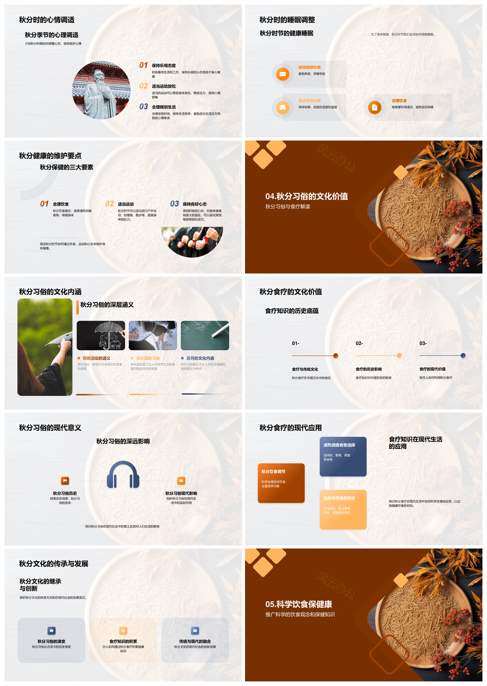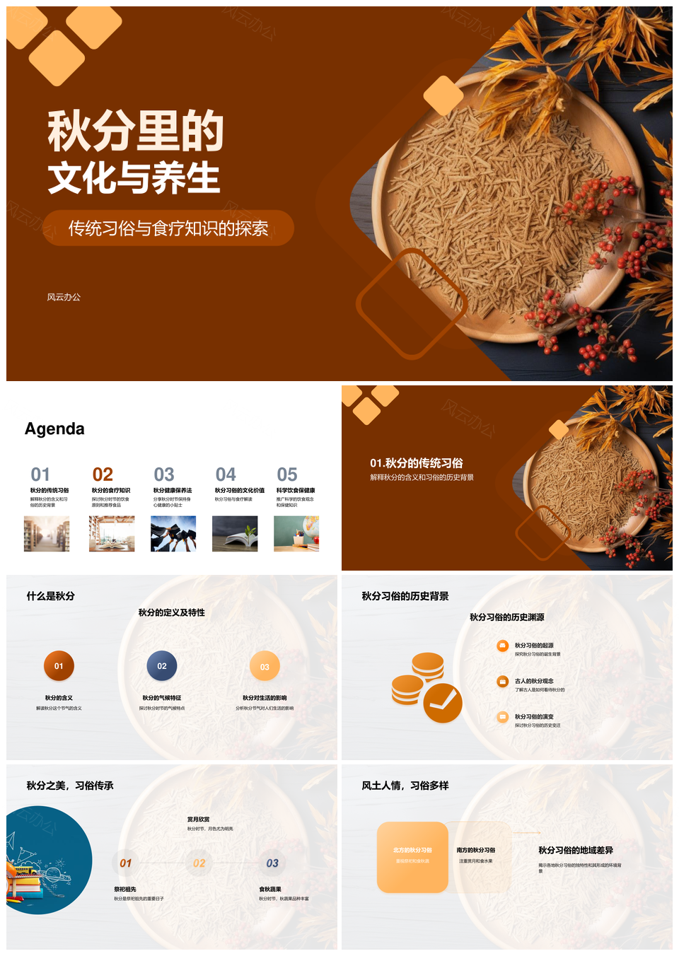 风云办公提供的秋分文化习俗养生润燥食疗清热PPT模板,下载格式为pptx,一共33页,作品中文字及图均可以修改和编辑,图片更改请在作品中右键图片并更换,文字修改请直接点击文字进行修改。