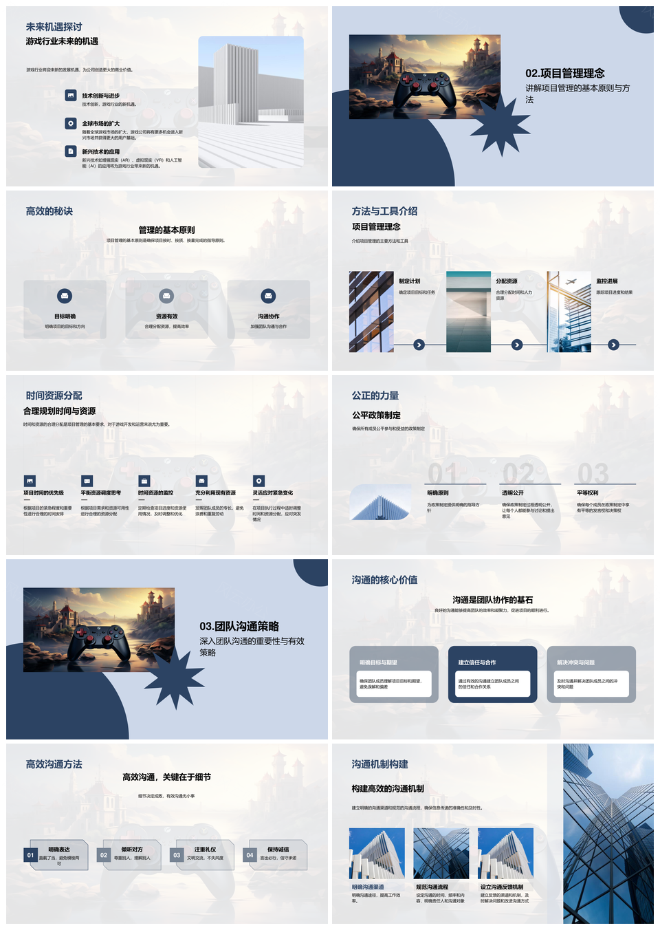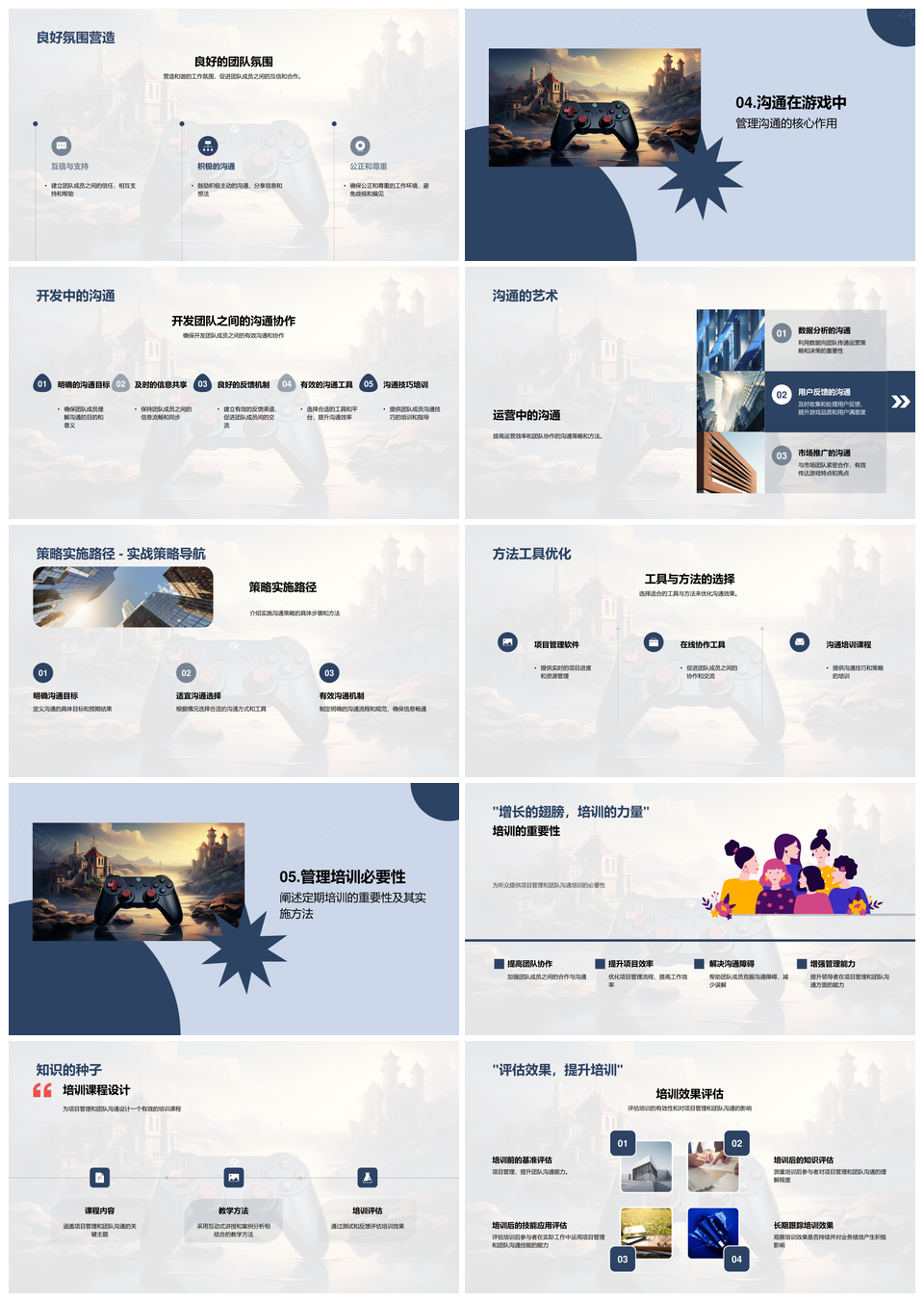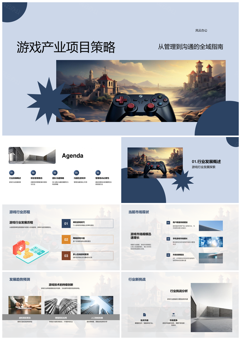 风云办公提供的游戏产业项目开发运营管理沟通策略PPT模板,下载格式为pptx,一共29页,作品中文字及图均可以修改和编辑,图片更改请在作品中右键图片并更换,文字修改请直接点击文字进行修改。