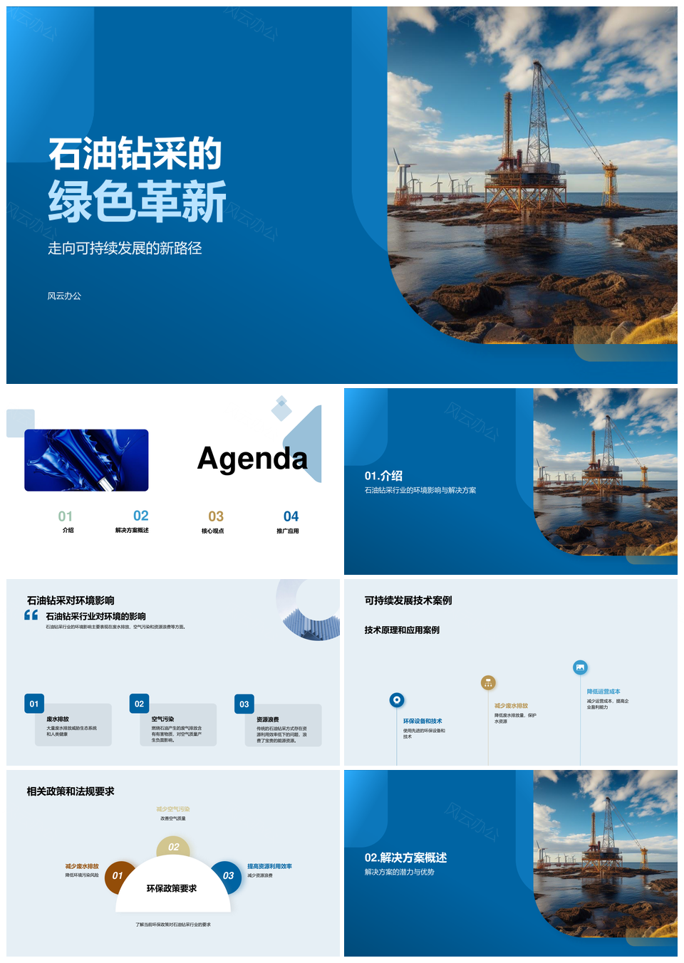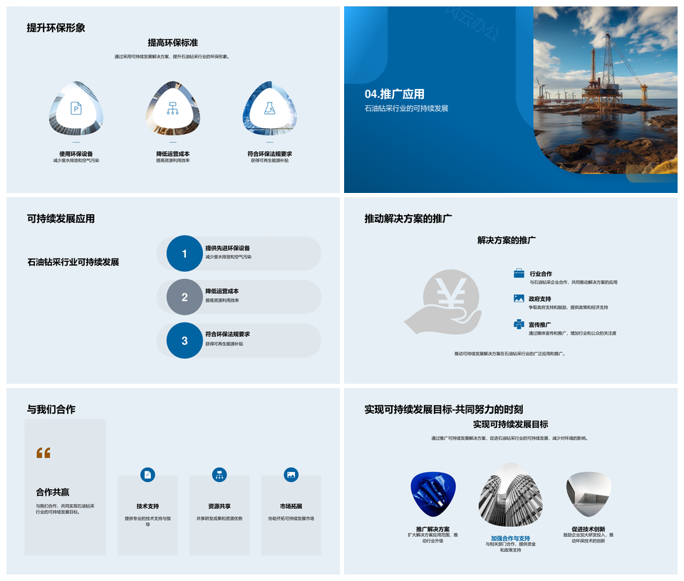 风云办公提供的石油钻采可持续技术环保解决方案PPT模板,下载格式为pptx,一共24页,作品中文字及图均可以修改和编辑,图片更改请在作品中右键图片并更换,文字修改请直接点击文字进行修改。