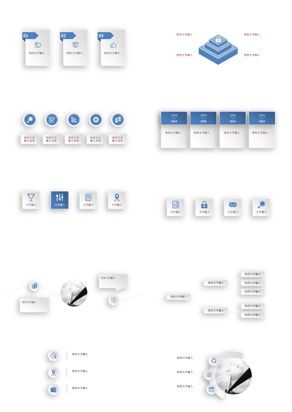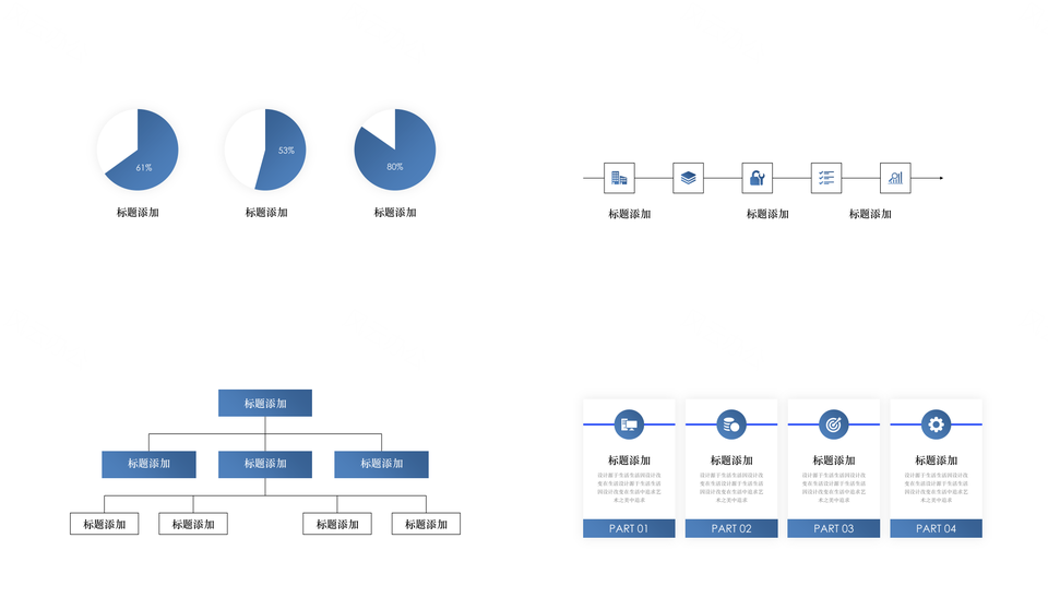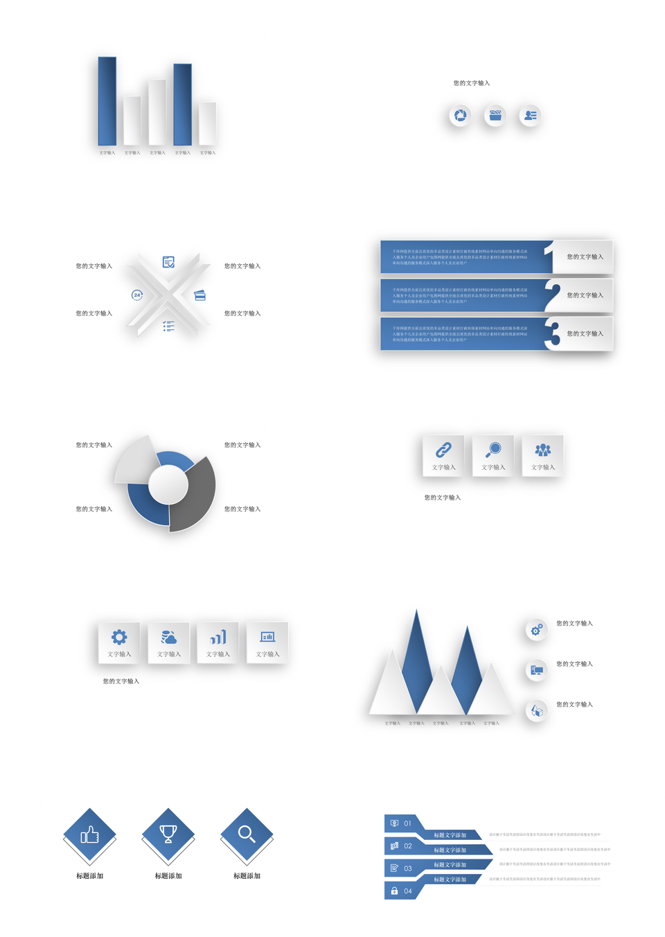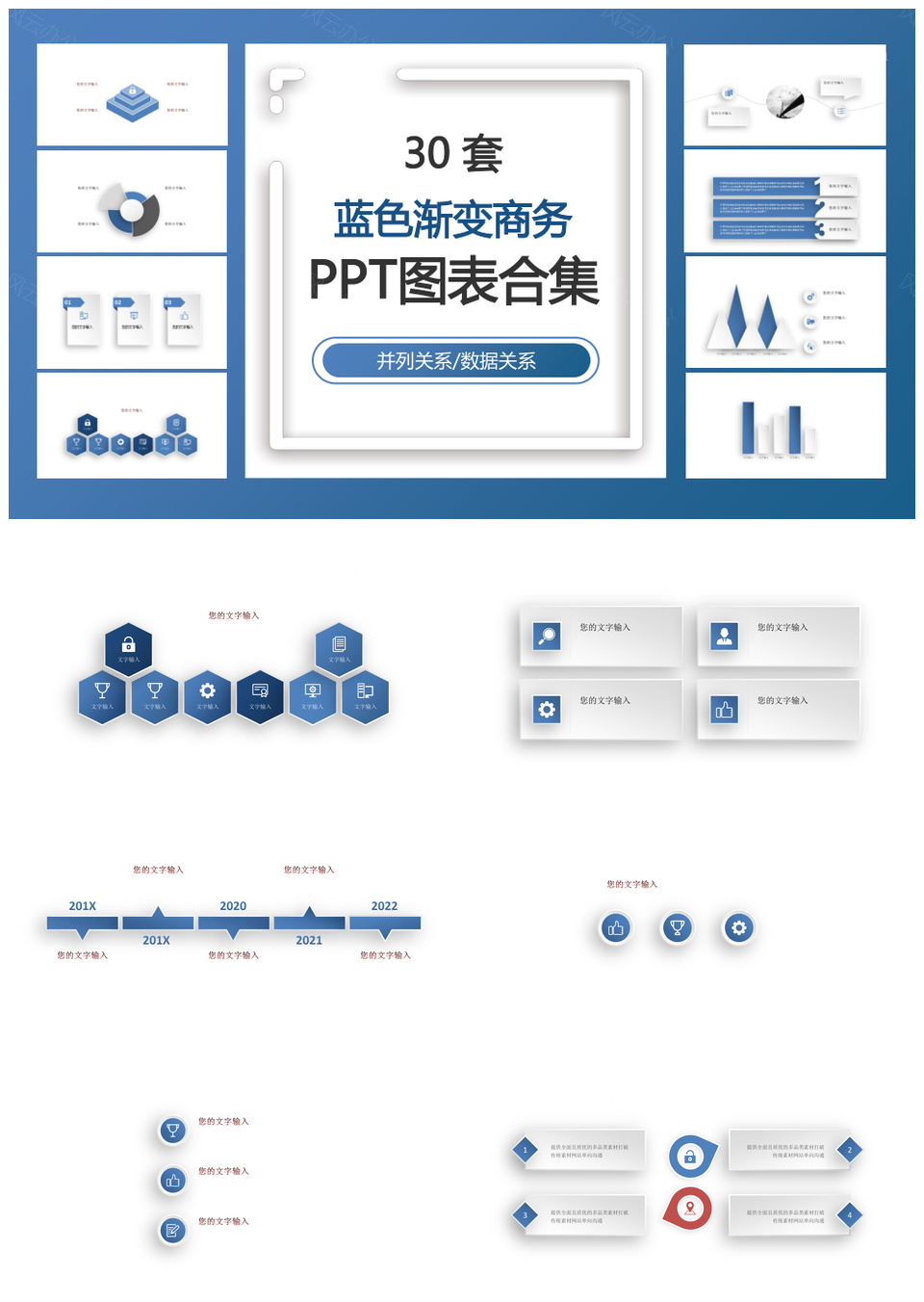 风云办公提供的蓝色渐变商务并列关系数据关系PPT图表合集,下载格式为pptx,一共31页,作品中文字及图均可以修改和编辑,图片更改请在作品中右键图片并更换,文字修改请直接点击文字进行修改。