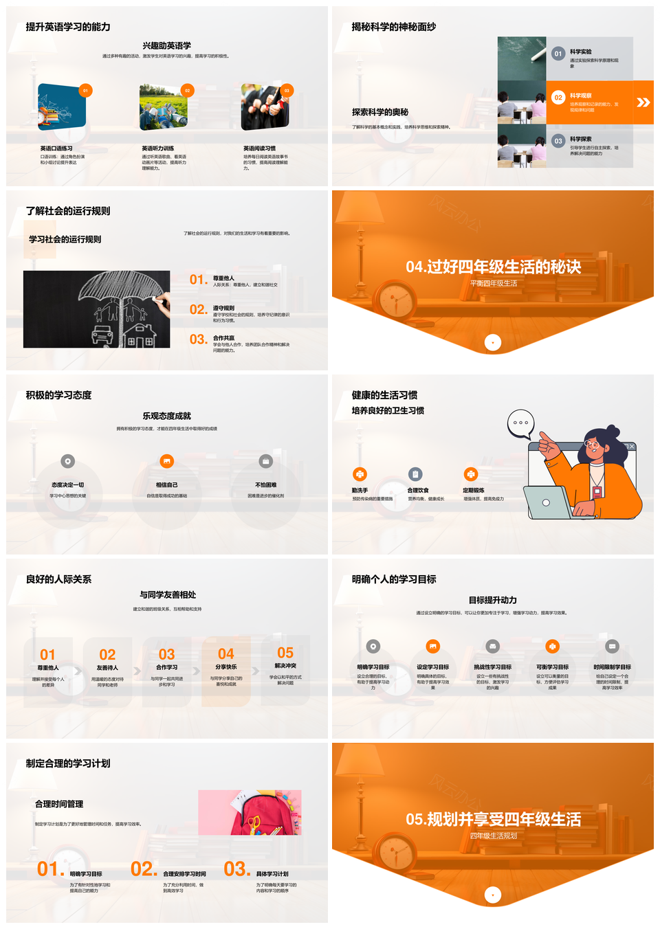 这是一张四年级学科学习独立解题时间管理课外体育阅读态度PPT模板,包含四年级、学科学习、独立解题、时间管理、课外体育、阅读态度等主题内容,也可用作四年级学科学习独立解题、学科学习独立解题时间管理、学习独立解题时间管理课外、独立解题时间管理课外体育、时间管理课外体育阅读、课外体育阅读态度、四年级学科学习、学科学习独立解题、学习独立解题时间管理、独立解题时间管理课外、时间管理课外体育、课外体育阅读、体育阅读态度、四年级学科、学科学习等PPT场景使用。 风云办公提供的四年级学科学习独立解题时间管理课外体育阅读态度PPT模板,下载格式为pptx,一共33页,作品中文字及图均可以修改和编辑,图片更改请在作品中右键图片并更换,文字修改请直接点击文字进行修改。
