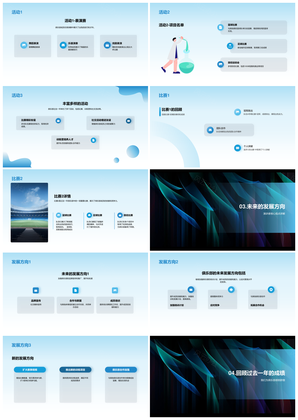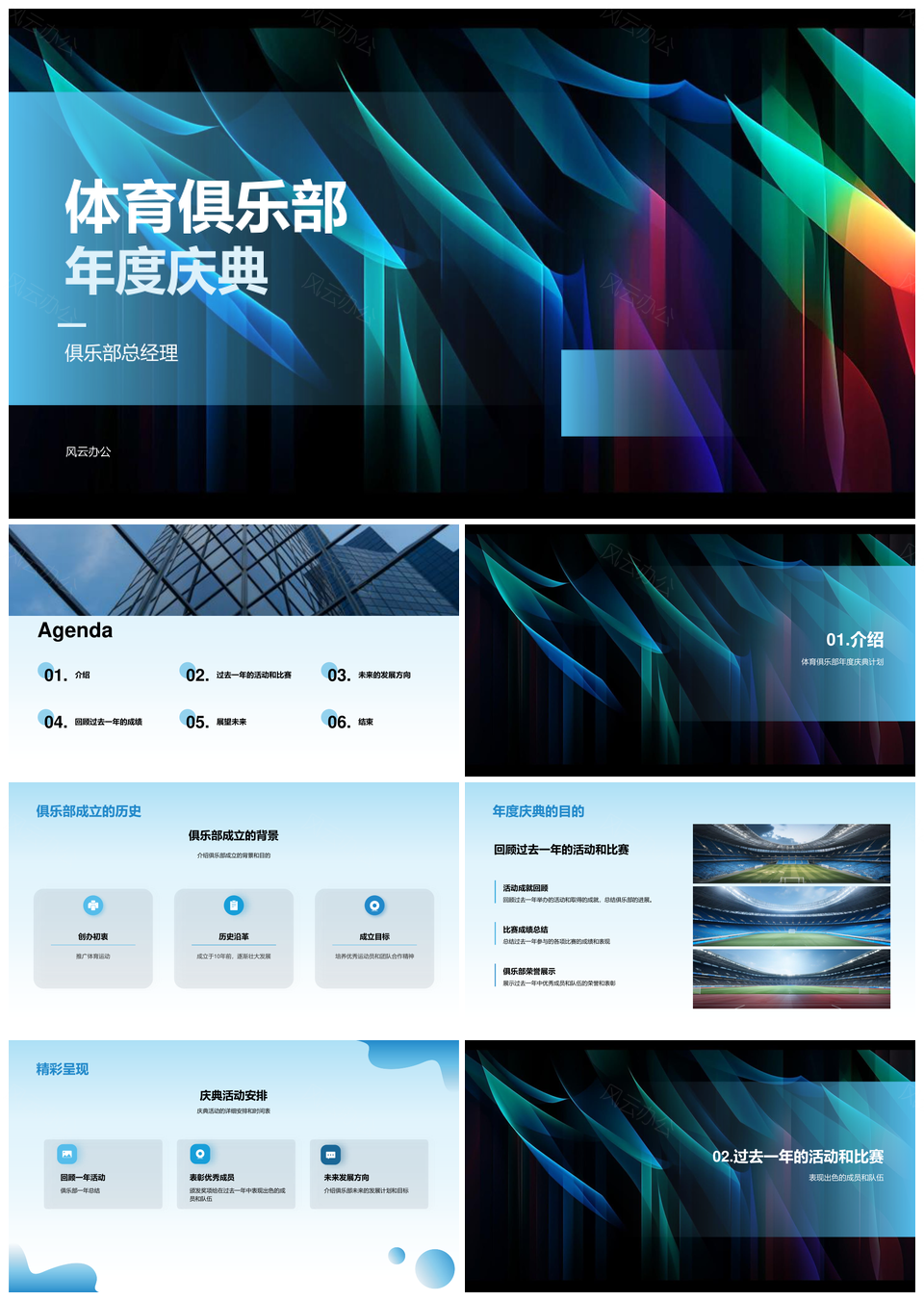 风云办公提供的体育俱乐部年度盛典PPT模板,下载格式为pptx,一共26页,作品中文字及图均可以修改和编辑,图片更改请在作品中右键图片并更换,文字修改请直接点击文字进行修改。