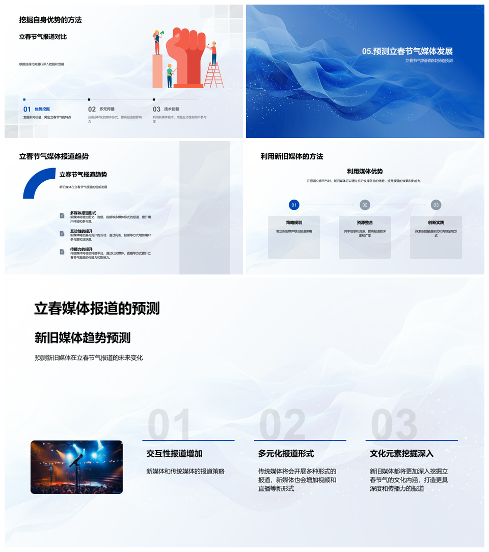 这是一张2025立春新旧媒体文化传播趋势对比PPT模板,包含2025、立春、新旧媒体、文化、传播趋势、对比等主题内容,也可用作2025立春新旧媒体、立春新旧媒体文化、新旧媒体文化传播、媒体文化传播趋势、文化传播趋势对比、2025立春新旧、立春新旧媒体、新旧媒体文化、媒体文化传播、文化传播趋势、传播趋势对比、2025立春、立春新旧、新旧媒体、媒体文化等PPT场景使用。 风云办公提供的2025立春新旧媒体文化传播趋势对比PPT模板,下载格式为pptx,一共23页,作品中文字及图均可以修改和编辑,图片更改请在作品中右键图片并更换,文字修改请直接点击文字进行修改。