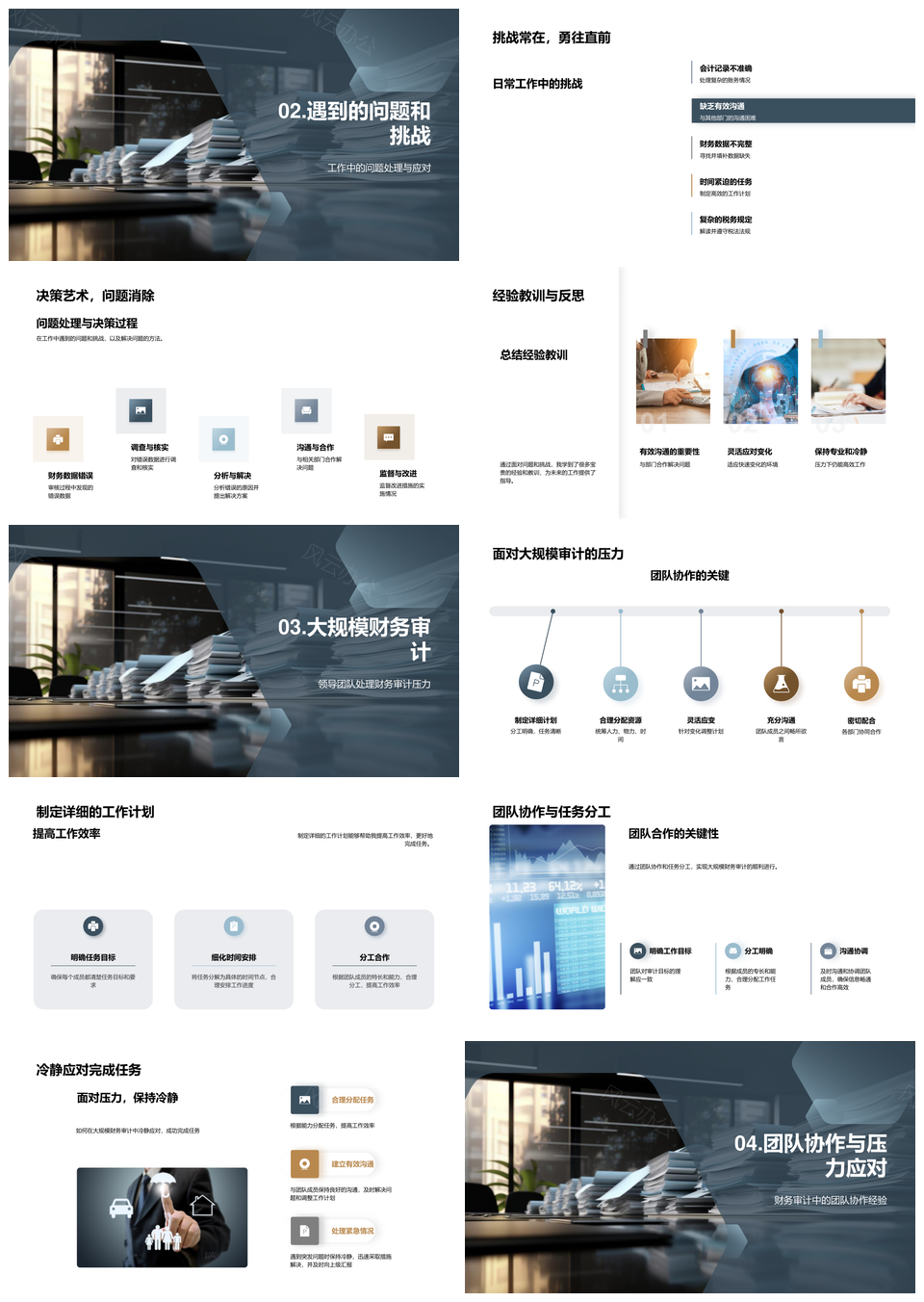 风云办公提供的审计师实践挑战与团队协作发展PPT模板,下载格式为pptx,一共25页,作品中文字及图均可以修改和编辑,图片更改请在作品中右键图片并更换,文字修改请直接点击文字进行修改。