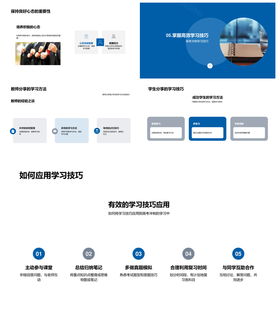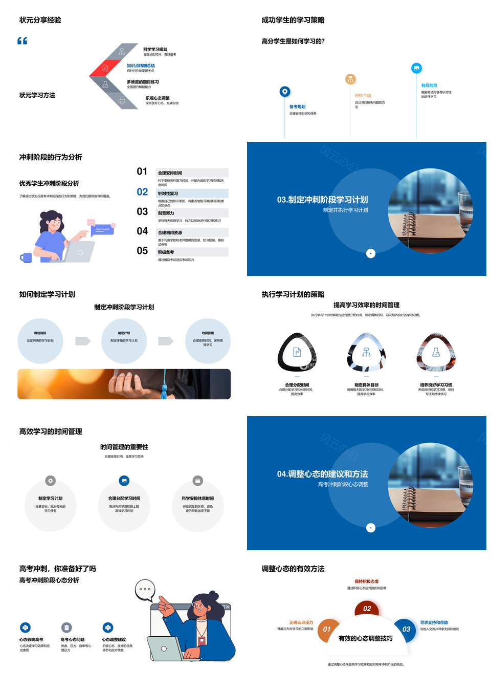 这是一张高考冲刺策略高效学习规划时间管理技巧PPT模板,包含高考冲刺、策略、高效学习、规划、时间管理、技巧等主题内容,也可用作高考冲刺策略高效、冲刺策略高效学习、策略高效学习规划、高效学习规划时间、学习规划时间管理、规划时间管理技巧、高考冲刺策略、冲刺策略高效、策略高效学习、高效学习规划、学习规划时间、规划时间管理、时间管理技巧、高考冲刺、冲刺策略等PPT场景使用。 风云办公提供的高考冲刺策略高效学习规划时间管理技巧PPT模板,下载格式为pptx,一共23页,作品中文字及图均可以修改和编辑,图片更改请在作品中右键图片并更换,文字修改请直接点击文字进行修改。