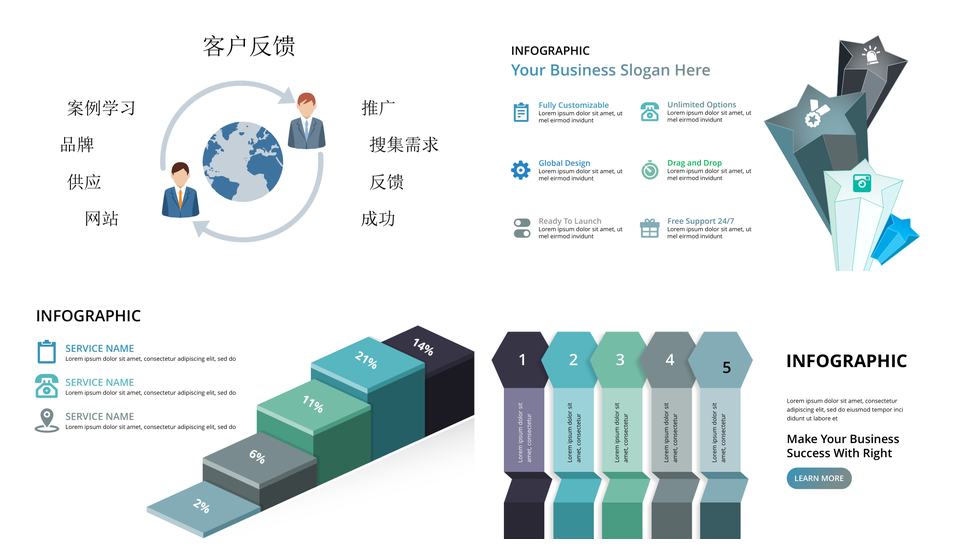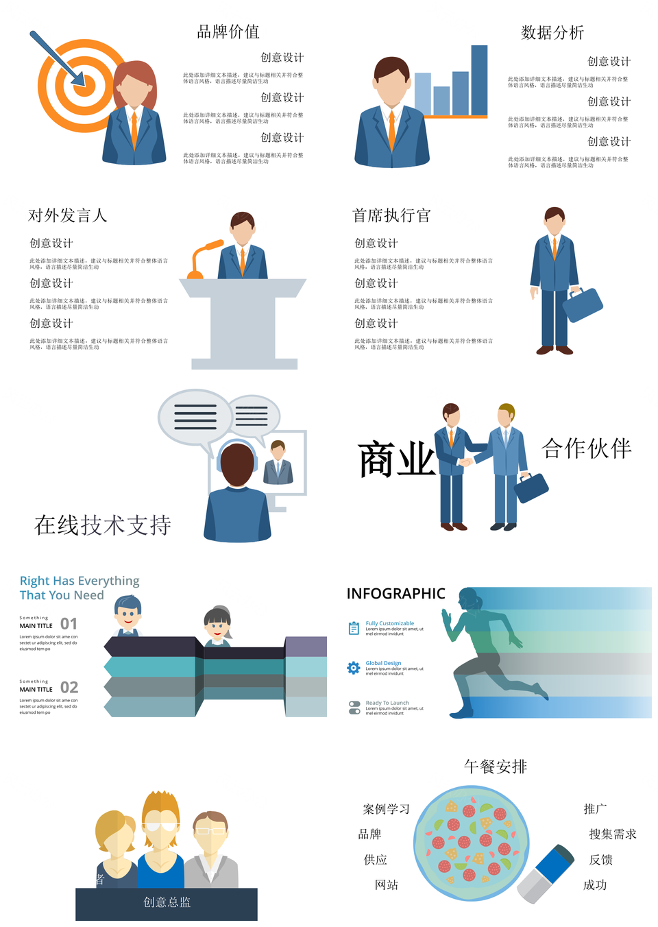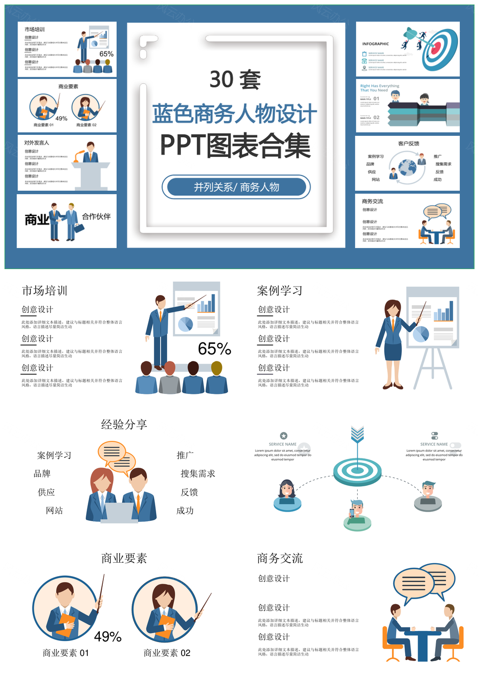蓝色商务人物设计并列关系商务人物PPT图表合集推荐