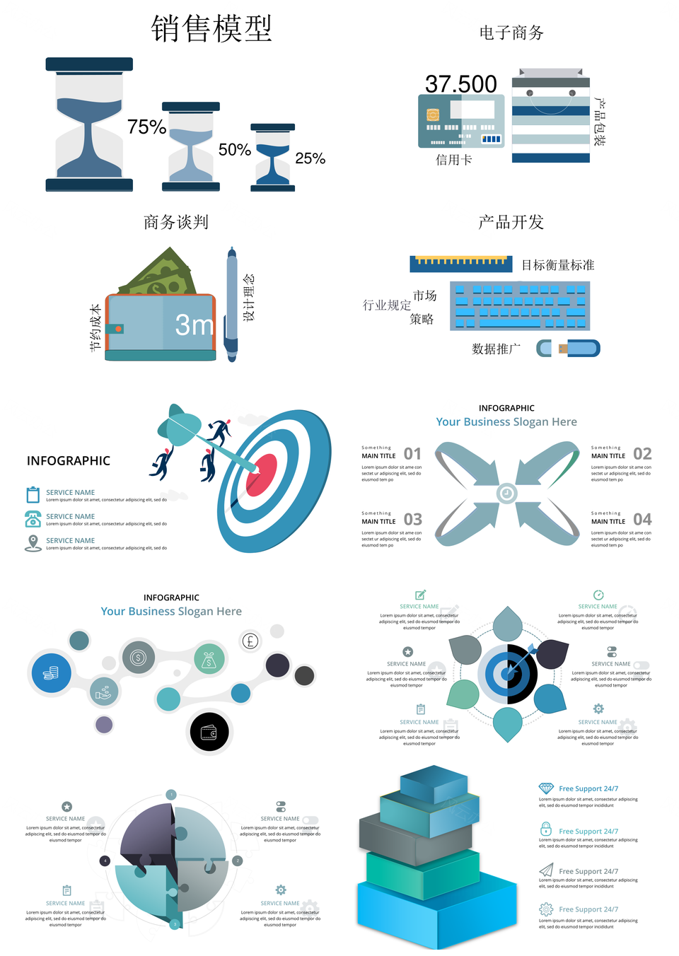 蓝色100套清新商务实用图表合集包!!PPT模板