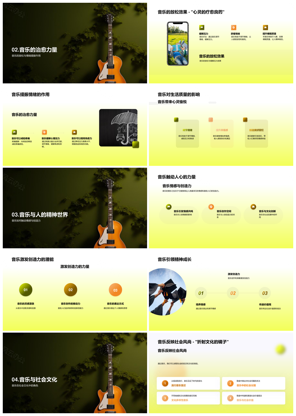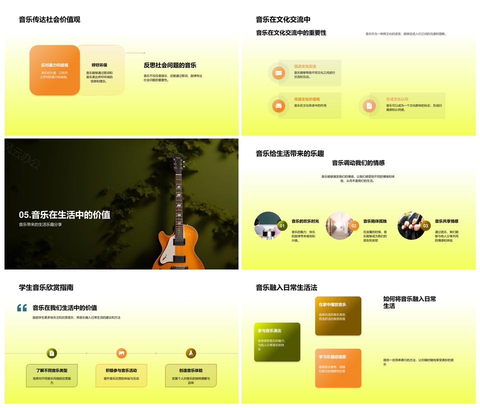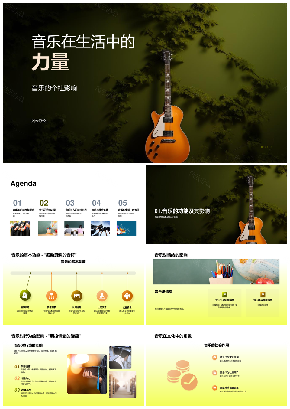 风云办公提供的音乐社会力量功能符号生活PPT模板,下载格式为pptx,一共24页,作品中文字及图均可以修改和编辑,图片更改请在作品中右键图片并更换,文字修改请直接点击文字进行修改。