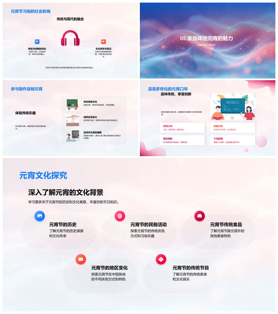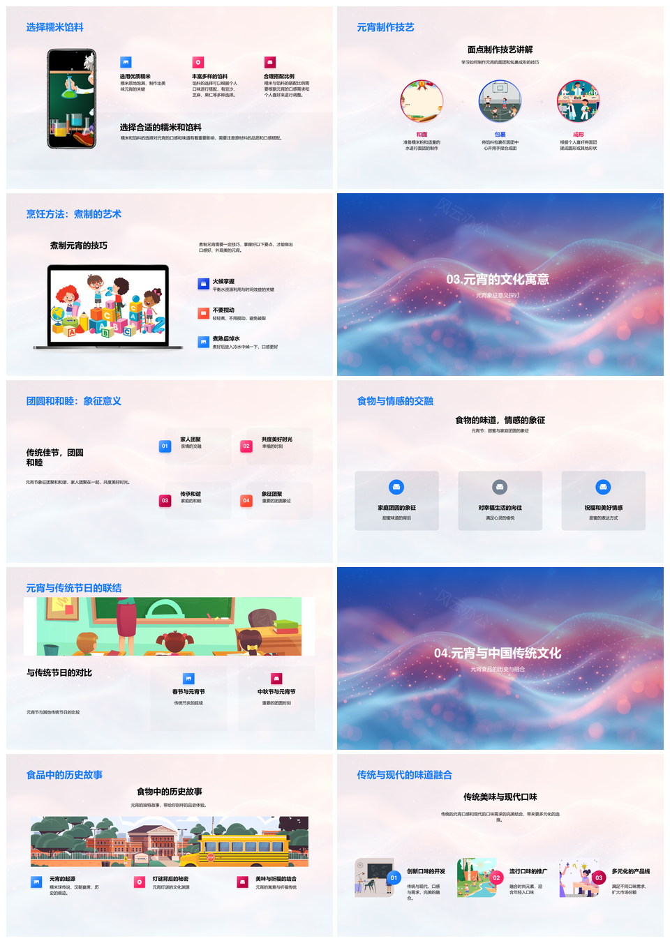 这是一张元宵节灯会糯米元宵制作技艺团圆传统文化PPT模板,包含元宵节、灯会、糯米元宵、制作技艺、团圆、传统文化等主题内容,也可用作元宵节灯会糯米元宵制作技艺、元宵节灯会糯米元宵、灯会糯米元宵制作技艺、糯米元宵制作技艺传统文化、元宵节灯会制作技艺、元宵节灯会团圆传统文化、糯米元宵制作技艺、灯会糯米元宵、元宵节传统文化灯会、制作技艺团圆传统文化、元宵节灯会团圆、糯米元宵团圆、元宵节灯会、糯米元宵、制作技艺传统文化等PPT场景使用。 风云办公提供的元宵节灯会糯米元宵制作技艺团圆传统文化PPT模板,下载格式为pptx,一共23页,作品中文字及图均可以修改和编辑,图片更改请在作品中右键图片并更换,文字修改请直接点击文字进行修改。