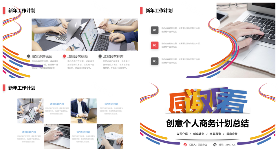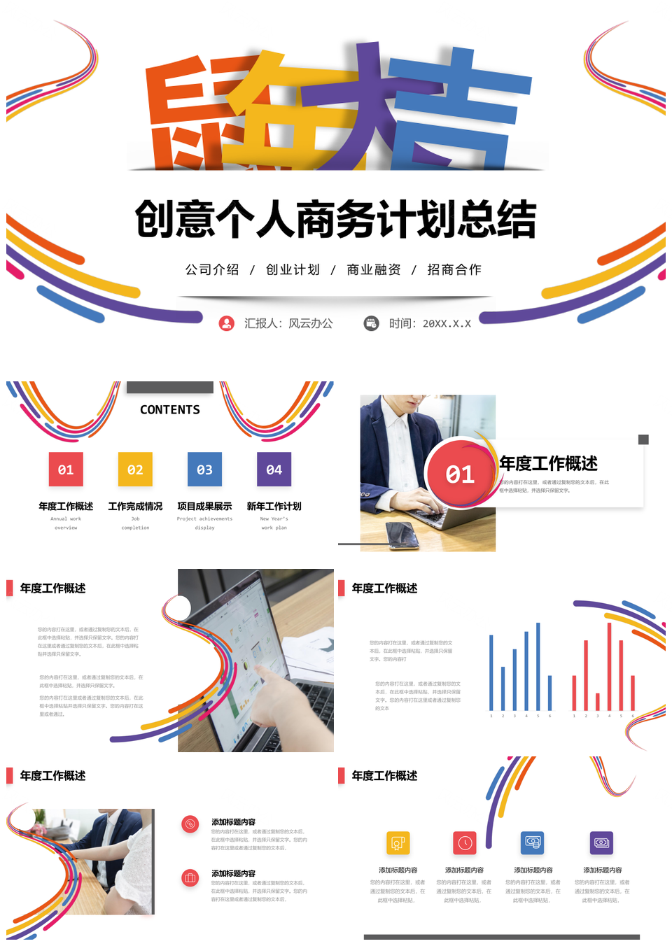 风云办公提供的创意个人商务活动计划总结PPT模板,下载格式为pptx,一共21页,作品中文字及图均可以修改和编辑,图片更改请在作品中右键图片并更换,文字修改请直接点击文字进行修改。