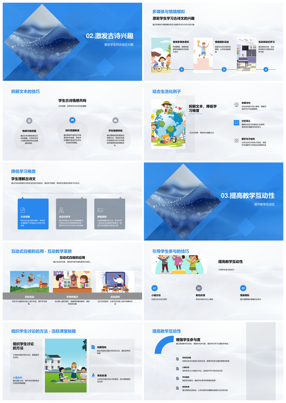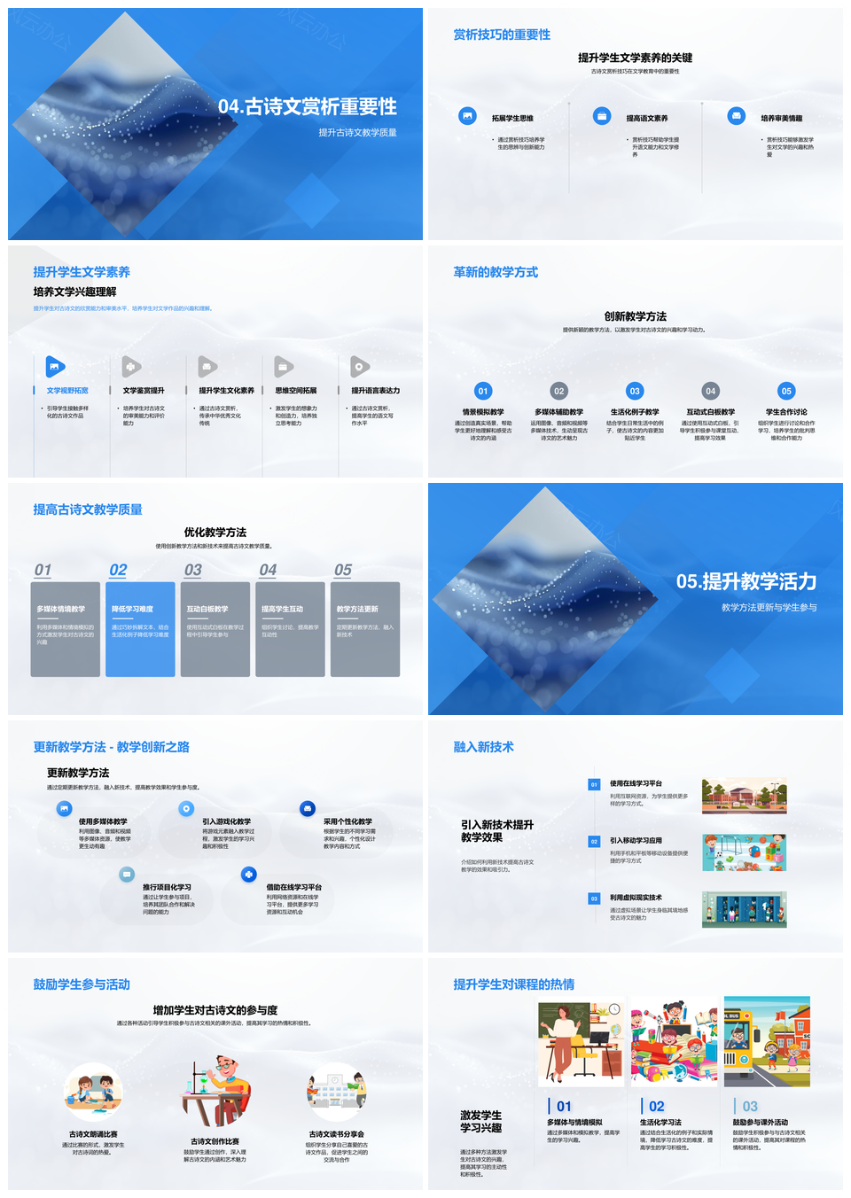 这是一张高中古诗文教改激趣提质多媒体情境互动策略PPT模板,包含高中、古诗文、教改、激趣、提质、多媒体、情境、互动、策略等主题内容,也可用作高中古诗文教改激趣提质、古诗文教改激趣提质多媒体、教改激趣提质多媒体情境、激趣提质多媒体情境互动、提质多媒体情境互动策略、高中古诗文教改激趣、古诗文教改多媒体情境、教改激趣互动策略、多媒体情境互动策略、高中教改激趣提质、古诗文提质多媒体互动、教改激趣情境策略、高中古诗文互动策略、激趣情境互动策略、教改提质情境互动等PPT场景使用。 风云办公提供的高中古诗文教改激趣提质多媒体情境互动策略PPT模板,下载格式为pptx,一共28页,作品中文字及图均可以修改和编辑,图片更改请在作品中右键图片并更换,文字修改请直接点击文字进行修改。
