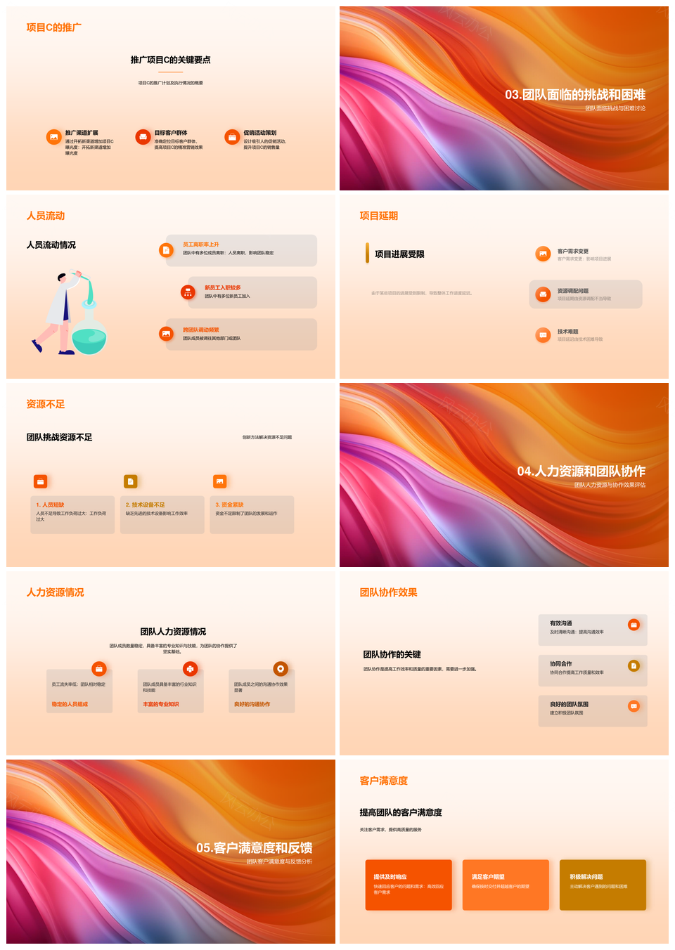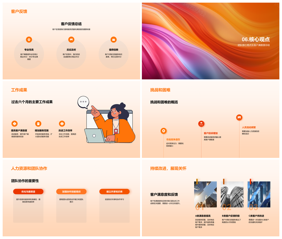 以活力橙色与柔和渐变为基调,这款商务PPT模板将专业性与视觉美学深度融合,流体渐变设计赋予页面动态平衡,简洁的扁平化图形搭配矢量元素,确保缩放无损清晰,适配各类屏幕与印刷场景。模块化布局兼顾科技感与实用性,分页逻辑清晰,有效呈现数据图表、产品方案及战略规划。抽象几何色块与低饱和背景形成视觉层次,既保留未来感,又避免信息过载,适用于科技、互联网、金融等行业提案,助力用户高效传递专业价值,提升内容说服力。