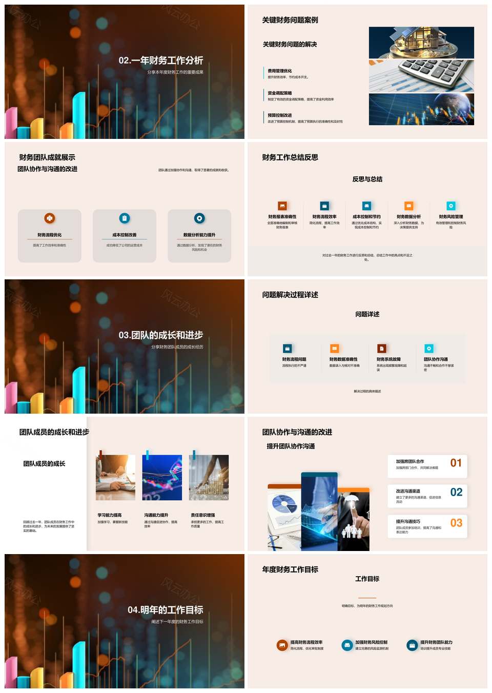 财务部年终团队成长收支制度执行改进风控案例成就柱状图PPT模板推荐