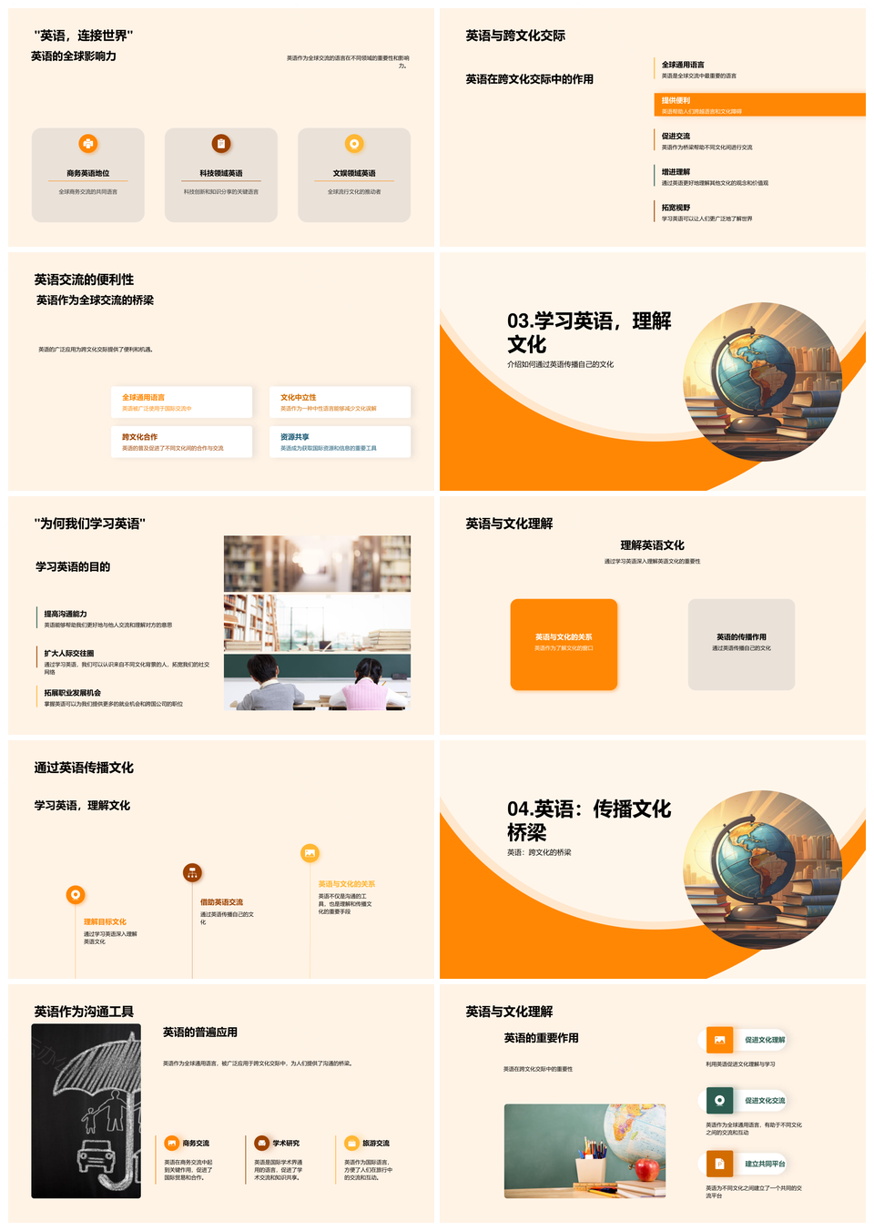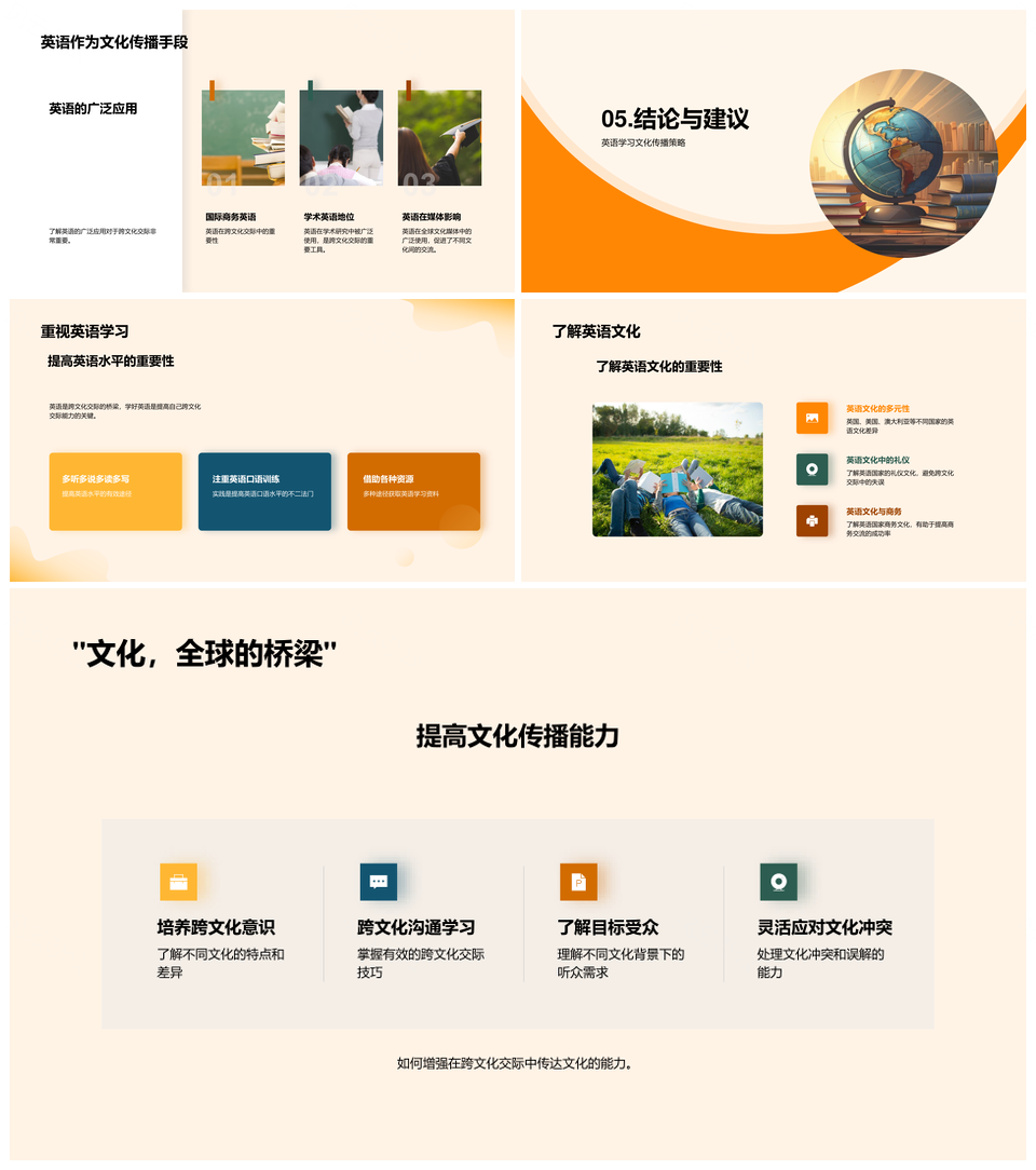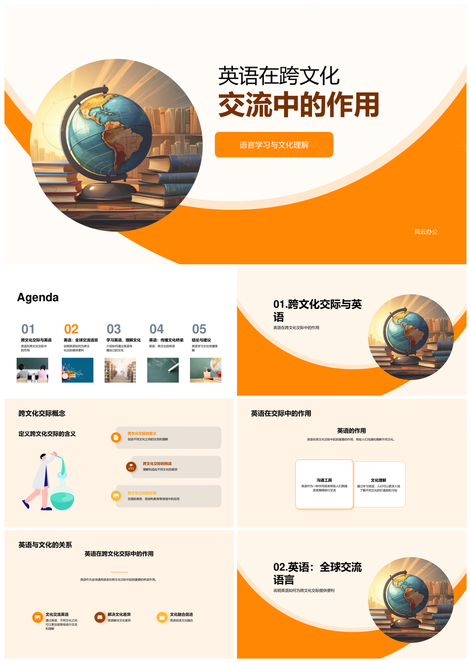 风云办公提供的英语全球通用语言促进跨文化交流教学PPT模板,下载格式为pptx,一共23页,作品中文字及图均可以修改和编辑,图片更改请在作品中右键图片并更换,文字修改请直接点击文字进行修改。