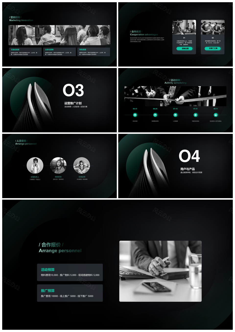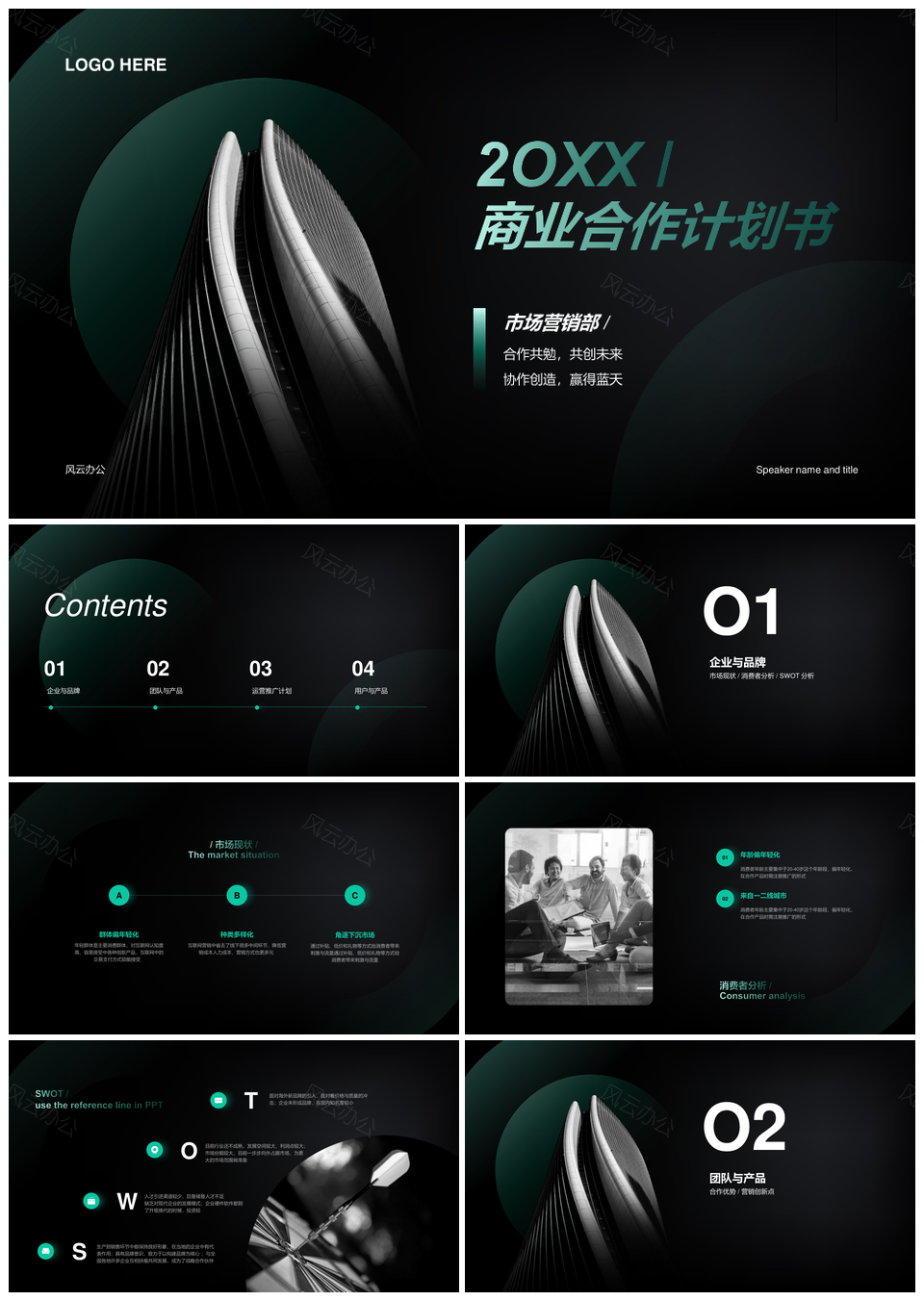 风云办公提供的绿色建筑商业合作计划书黑色简约PPT模板,下载格式为pptx,一共15页,作品中文字及图均可以修改和编辑,图片更改请在作品中右键图片并更换,文字修改请直接点击文字进行修改。