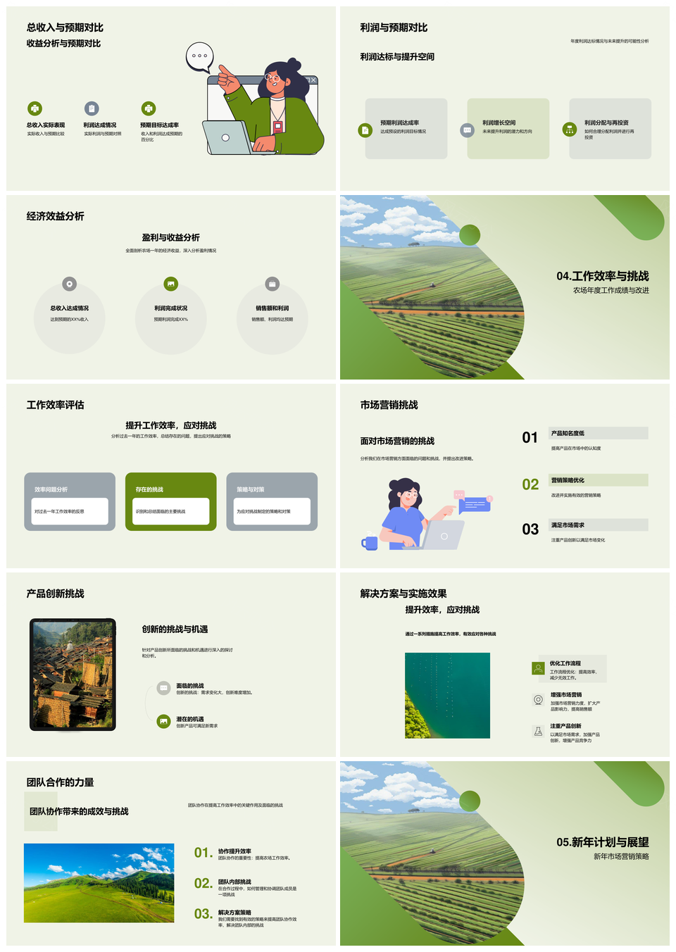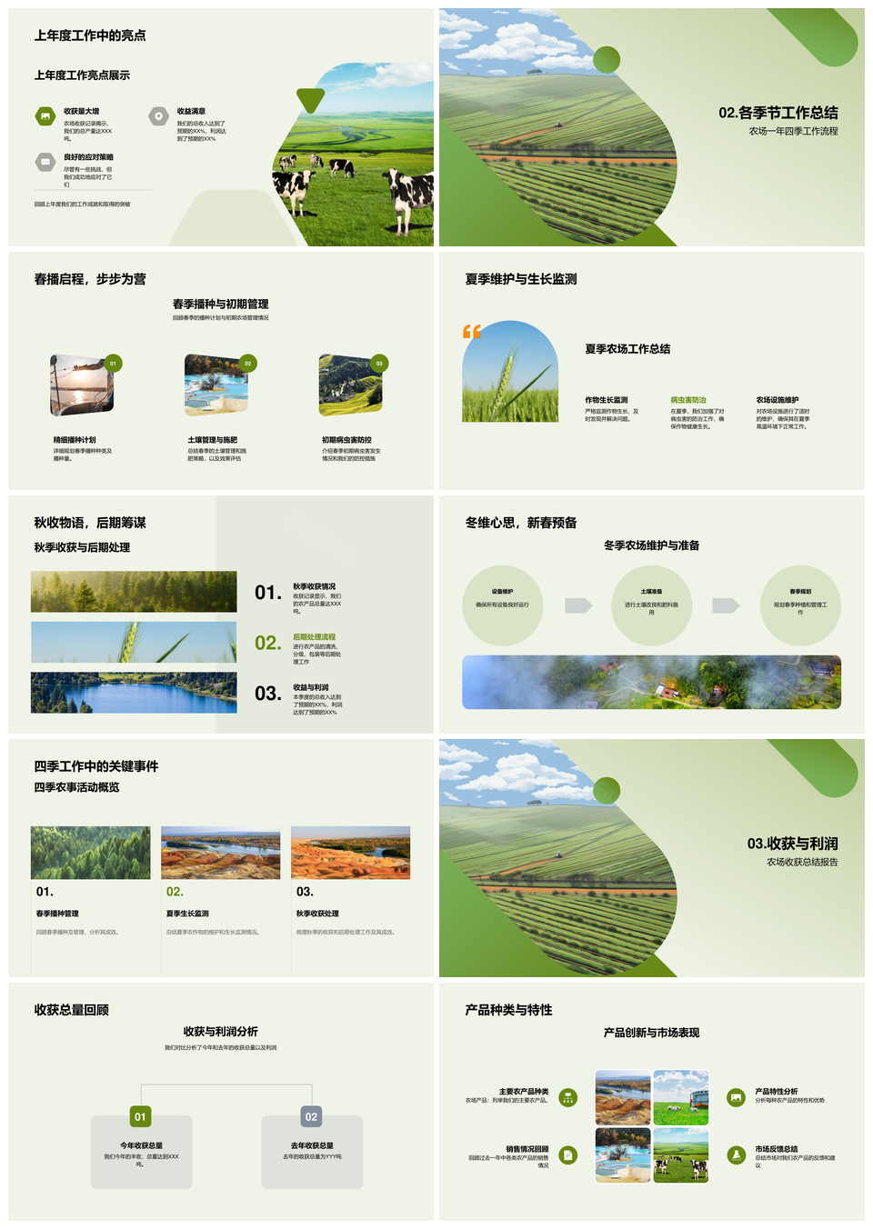 这是一张农场运营年度总结农业之路目标播种收获维护景观PPT模板,包含农场运营、年度总结、农业之路、目标、播种、收获、维护、景观等主题内容,也可用作农场运营年度总结、年度总结农业之路目标、农业之路目标播种收获、目标播种收获维护、播种收获维护景观、运营年度总结农业之路、农业之路目标播种、目标播种收获、播种收获维护、收获维护景观、农场运营农业之路、年度总结目标播种、农场运营目标播种、运营农业之路目标、维护景观农场运营等PPT场景使用。 风云办公提供的农场运营年度总结农业之路目标播种收获维护景观PPT模板,下载格式为pptx,一共33页,作品中文字及图均可以修改和编辑,图片更改请在作品中右键图片并更换,文字修改请直接点击文字进行修改。