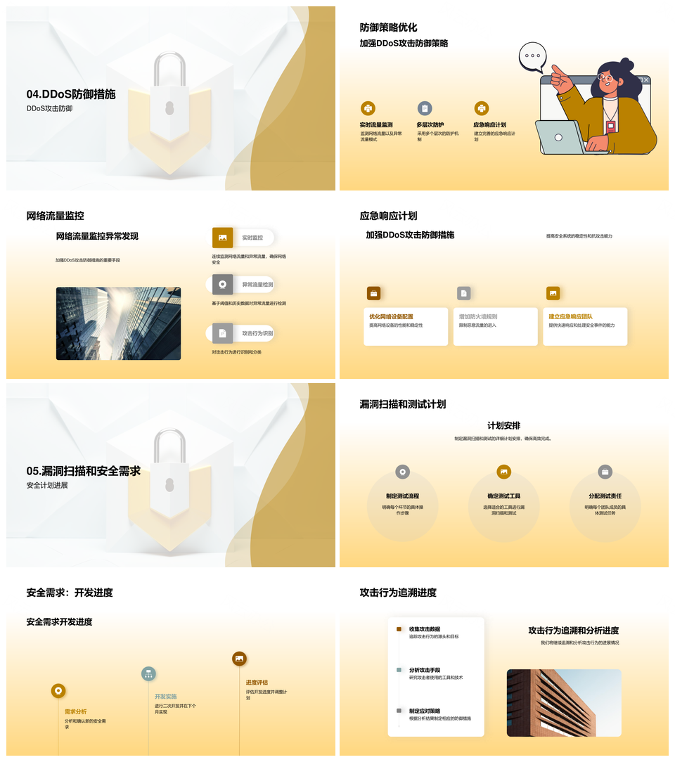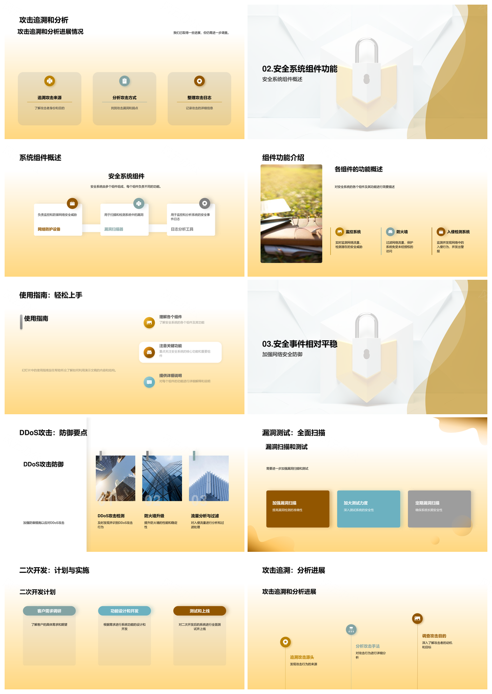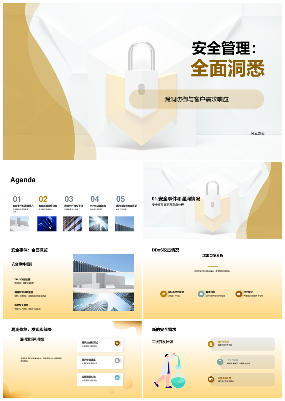 这是一张安全系统月度总结DDoS攻击防护数据事件汇报PPT模板,包含安全系统、月度总结、DDoS攻击、防护、数据、事件、汇报等主题内容,也可用作安全系统月度总结DDoS攻击防护、月度总结DDoS攻击防护数据、DDoS攻击防护数据事件汇报、安全系统月度DDoS攻击防护、月度DDoS攻击防护数据、总结DDoS攻击防护事件、DDoS攻击防护数据汇报、安全系统月度总结数据、月度总结防护数据事件、防护数据事件汇报、安全系统DDoS攻击数据、安全系统防护数据汇报、DDoS攻击数据事件汇报、月度防护数据事件、总结防护事件汇报等PPT场景使用。 风云办公提供的安全系统月度总结DDoS攻击防护数据事件汇报PPT模板,下载格式为pptx,一共26页,作品中文字及图均可以修改和编辑,图片更改请在作品中右键图片并更换,文字修改请直接点击文字进行修改。