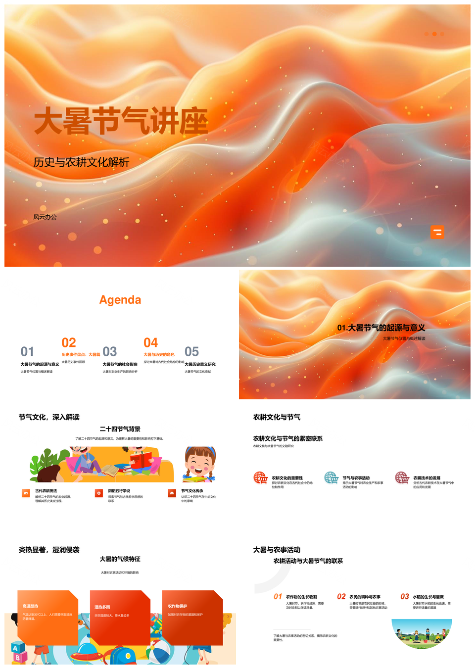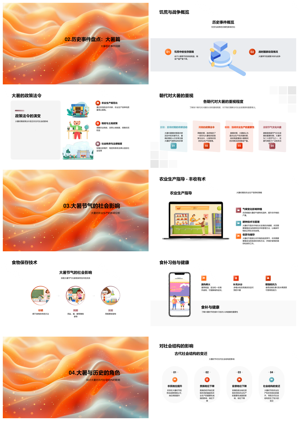 这是一张大暑节气农耕历史政策生产保存技术社会结构PPT模板,包含大暑节气、农耕历史、政策、生产、保存技术、社会结构等主题内容,也可用作大暑节气农耕历史、节气农耕历史政策、农耕历史政策生产、历史政策生产保存、政策生产保存技术、生产保存技术社会结构、大暑节气农耕生产、农耕生产保存技术、历史政策技术社会结构、政策生产社会结构、大暑节气历史政策、农耕政策生产保存、大暑生产保存技术、历史保存技术社会结构、节气政策生产社会等PPT场景使用。 风云办公提供的大暑节气农耕历史政策生产保存技术社会结构PPT模板,下载格式为pptx,一共24页,作品中文字及图均可以修改和编辑,图片更改请在作品中右键图片并更换,文字修改请直接点击文字进行修改。