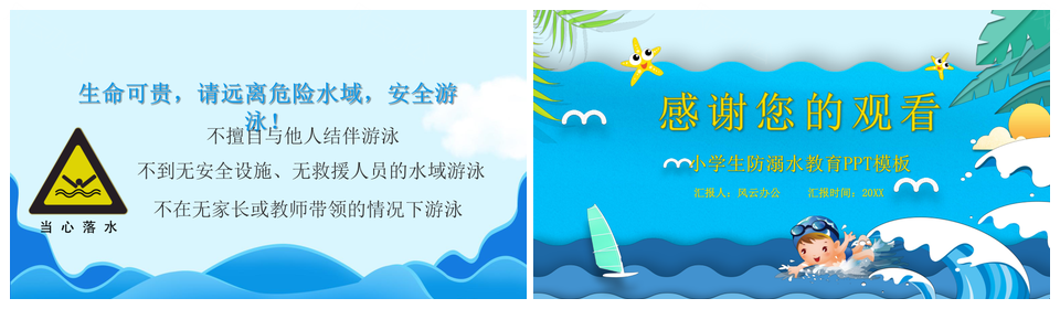 蓝色卡通风中小学生防溺水安全教育主题班会PPT模板