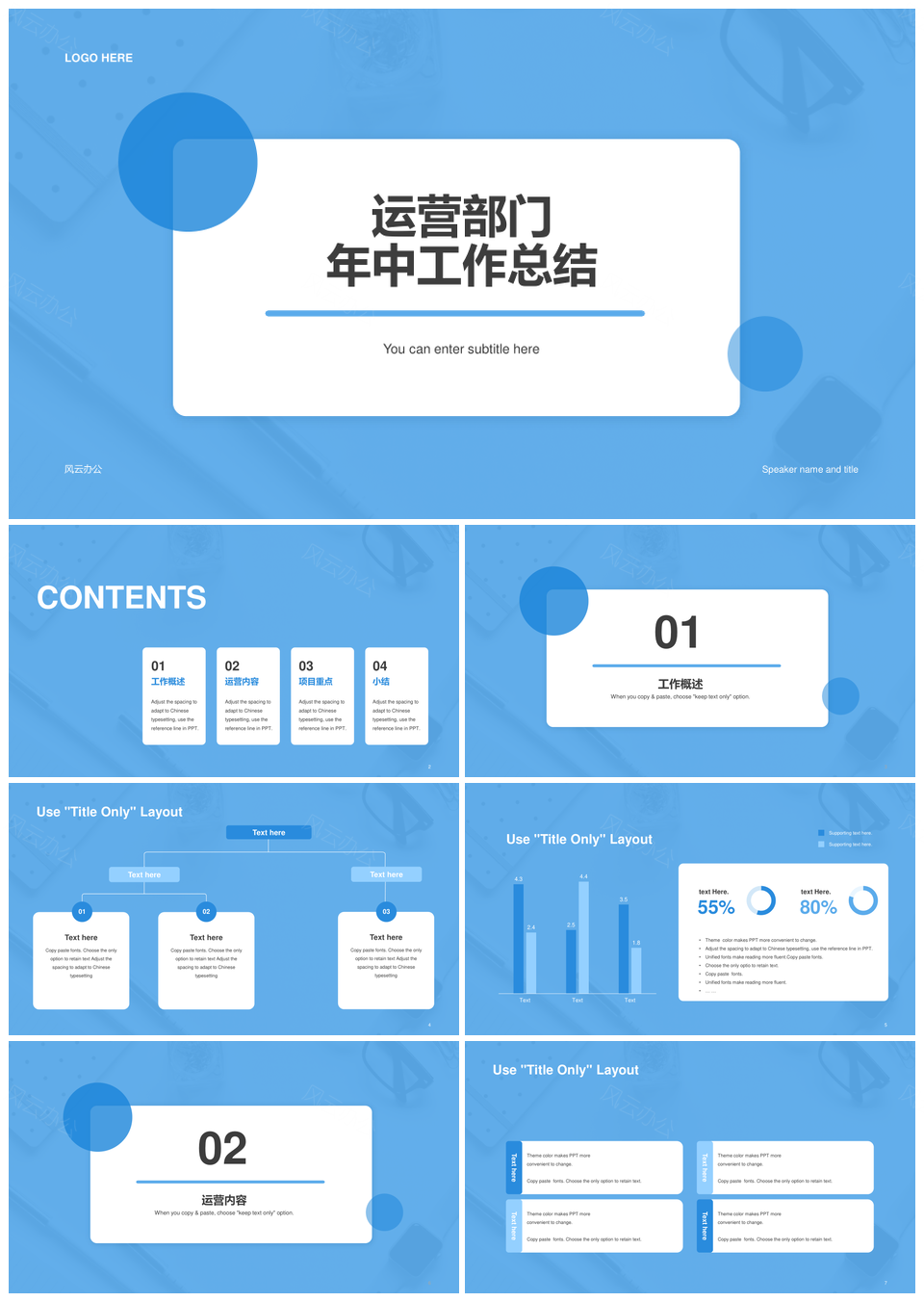 风云办公提供的蓝色企业商务运营年中工作总结PPT模板,下载格式为pptx,一共15页,作品中文字及图均可以修改和编辑,图片更改请在作品中右键图片并更换,文字修改请直接点击文字进行修改。