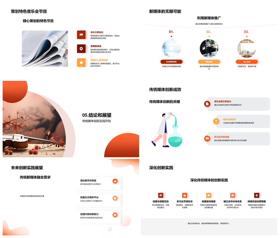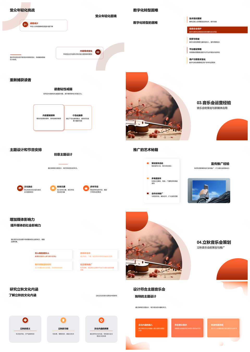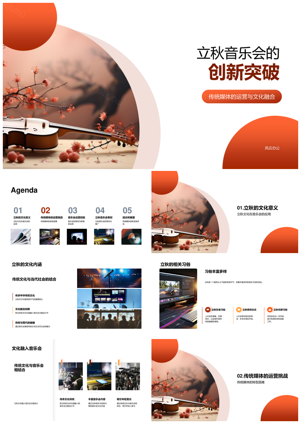这是一张立秋音乐会传统乐器融合创新运营年轻化PPT模板,包含立秋、音乐会、传统乐器、融合、创新、运营、年轻化等主题内容,也可用作立秋音乐会传统乐器融合、音乐会传统乐器融合创新、传统乐器融合创新运营、乐器融合创新运营年轻化、立秋音乐会融合创新、音乐会传统乐器融合、传统乐器创新运营年轻化、立秋传统乐器年轻化、融合创新运营年轻化、立秋音乐会运营、音乐会融合创新运营、传统乐器运营年轻化、立秋创新运营、融合运营年轻化、立秋音乐会年轻化等PPT场景使用。 风云办公提供的立秋音乐会传统乐器融合创新运营年轻化PPT模板,下载格式为pptx,一共24页,作品中文字及图均可以修改和编辑,图片更改请在作品中右键图片并更换,文字修改请直接点击文字进行修改。