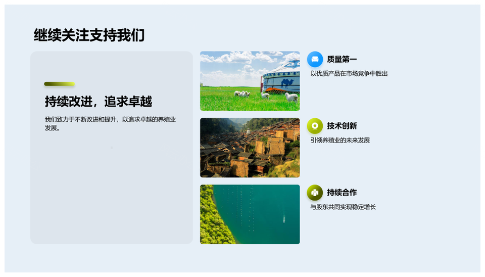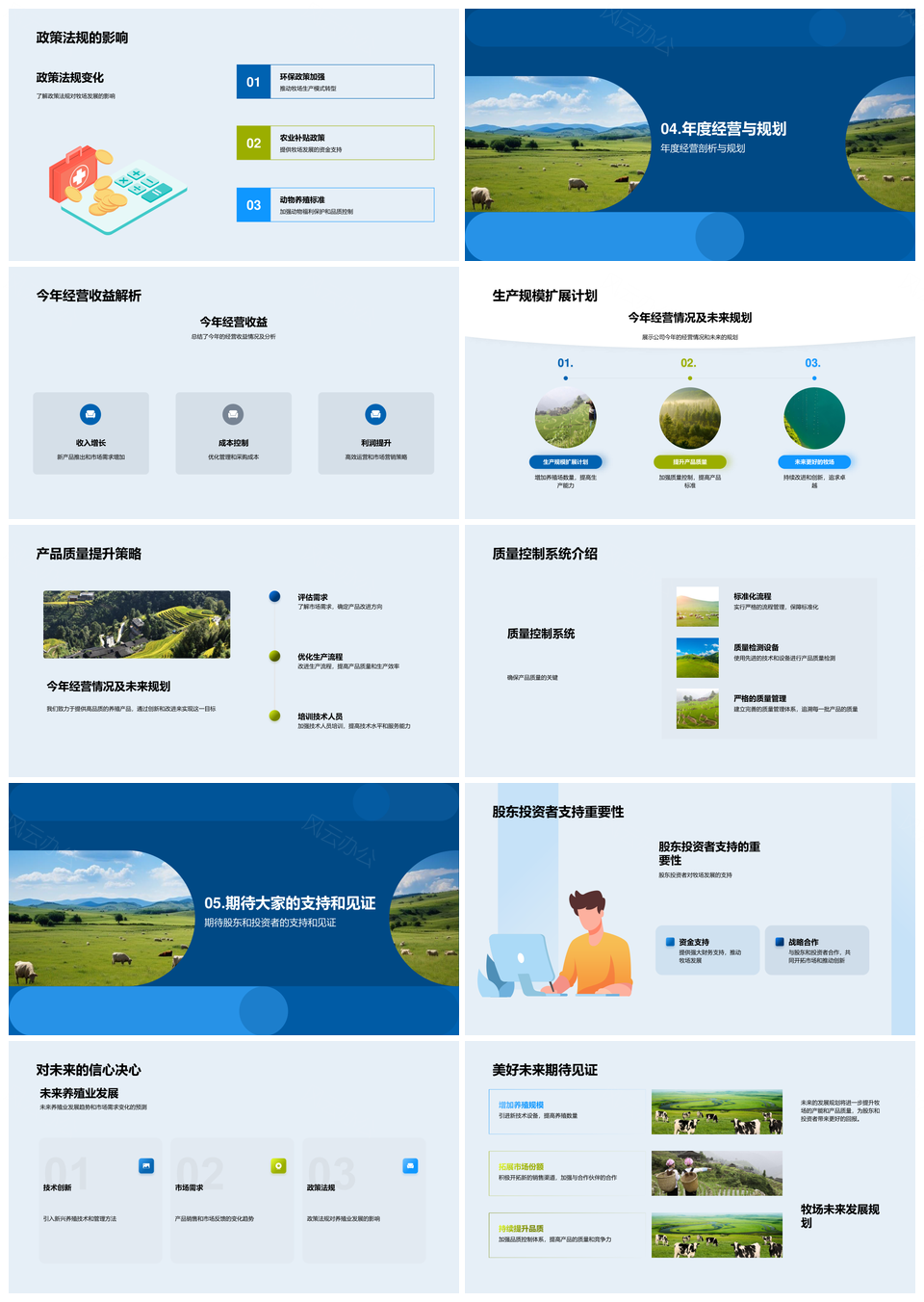 这是一张牧场业务年度盘点趋势技术市场环保责任PPT模板,包含牧场业务、年度盘点、趋势、技术、市场、环保责任等主题内容,也可用作牧场业务年度盘点、牧场业务年度趋势、业务年度盘点趋势、业务年度趋势技术、年度盘点趋势技术、趋势技术市场环保、技术市场环保责任、牧场业务年度技术、业务趋势技术市场、年度技术市场环保、盘点趋势技术市场、牧场市场环保责任、环保责任年度盘点、牧场技术市场环保、业务市场环保责任等PPT场景使用。 风云办公提供的牧场业务年度盘点趋势技术市场环保责任PPT模板,下载格式为pptx,一共29页,作品中文字及图均可以修改和编辑,图片更改请在作品中右键图片并更换,文字修改请直接点击文字进行修改。