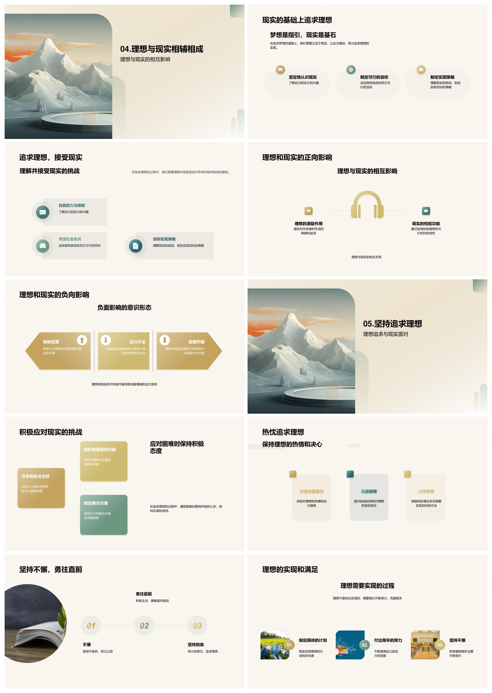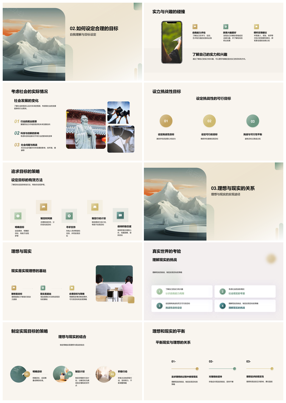 理想引领现实目标筑梦策略平衡人生山峰PPT模板推荐