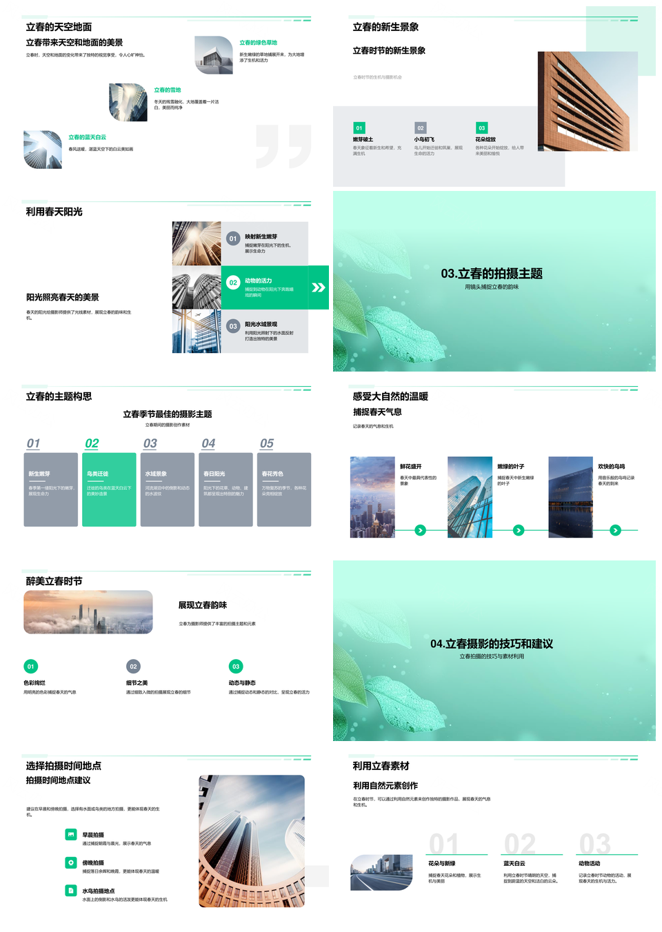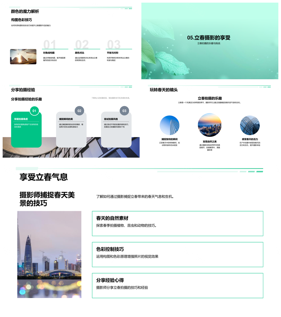 这是一张立春光影新芽摄影技巧人文景观时地主题PPT模板,包含立春、光影、新芽、摄影技巧、人文景观、时地主题等主题内容,也可用作立春光影新芽摄影技巧、光影新芽摄影技巧人文景观、新芽摄影技巧人文景观时地、摄影技巧人文景观时地主题、立春光影人文景观、立春新芽时地主题、光影新芽人文景观、摄影技巧时地主题、人文景观时地主题、光影新芽时地主题、立春光影、光影新芽、新芽摄影技巧、摄影技巧人文景观、人文景观时地等PPT场景使用。 风云办公提供的立春光影新芽摄影技巧人文景观时地主题PPT模板,下载格式为pptx,一共23页,作品中文字及图均可以修改和编辑,图片更改请在作品中右键图片并更换,文字修改请直接点击文字进行修改。