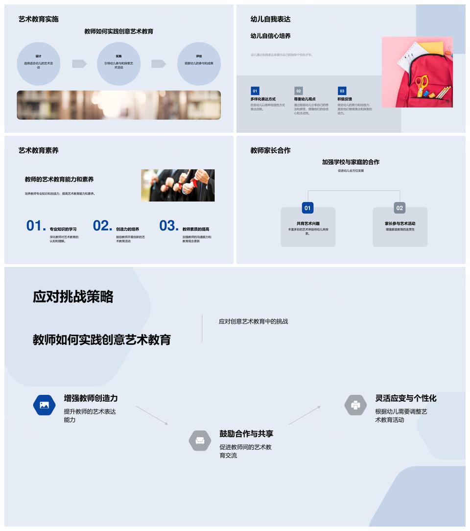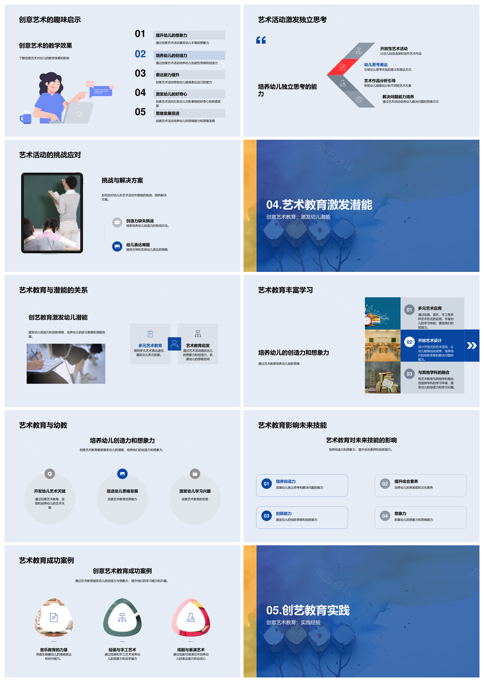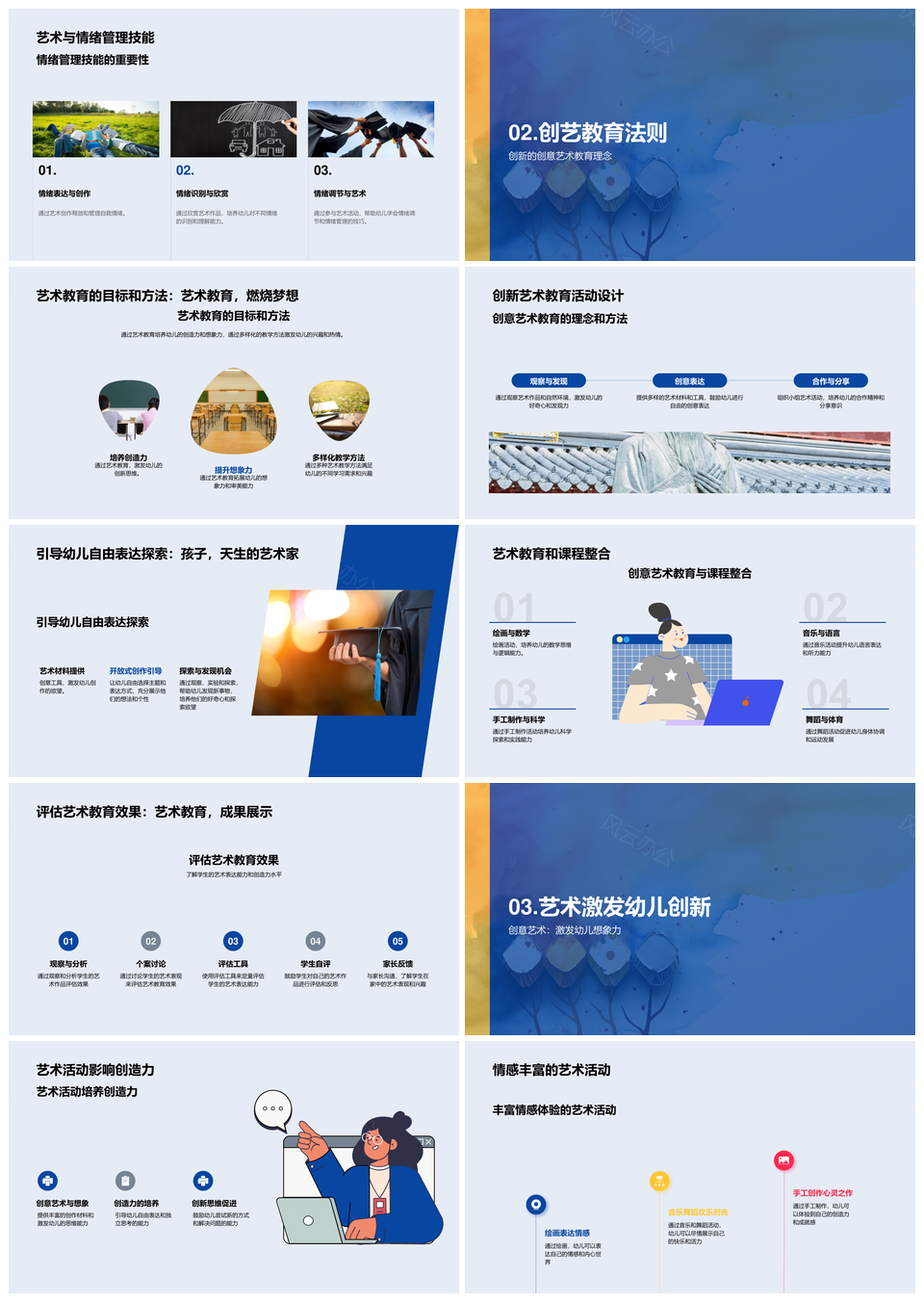 风云办公提供的创意艺术教育促进幼儿心理认知社交PPT模板,下载格式为pptx,一共33页,作品中文字及图均可以修改和编辑,图片更改请在作品中右键图片并更换,文字修改请直接点击文字进行修改。