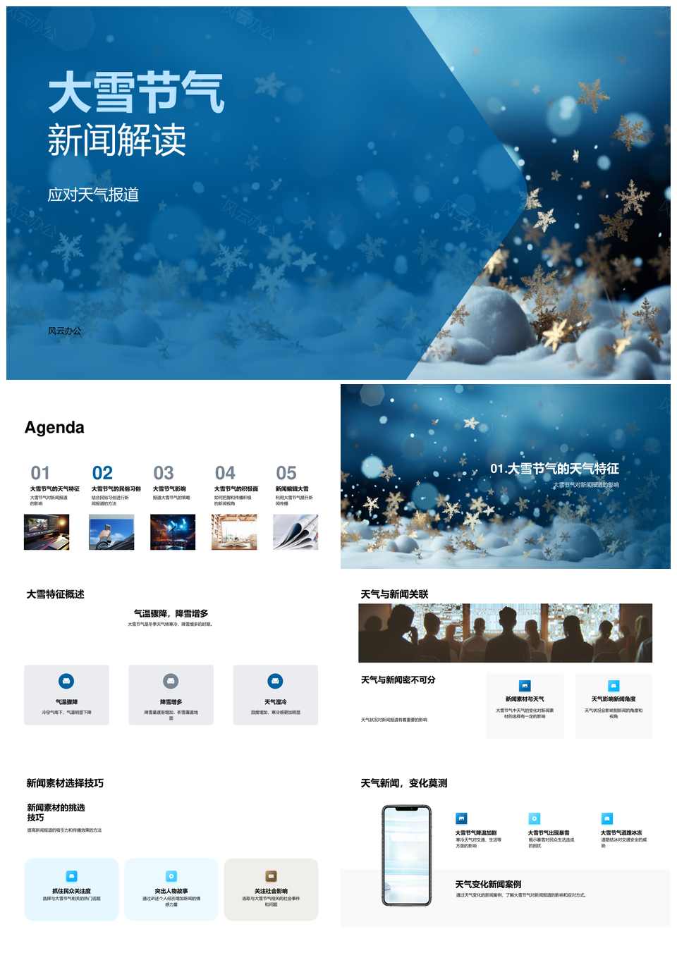 风云办公提供的大雪节气新闻解读天气民俗传统报道PPT模板,下载格式为pptx,一共28页,作品中文字及图均可以修改和编辑,图片更改请在作品中右键图片并更换,文字修改请直接点击文字进行修改。
