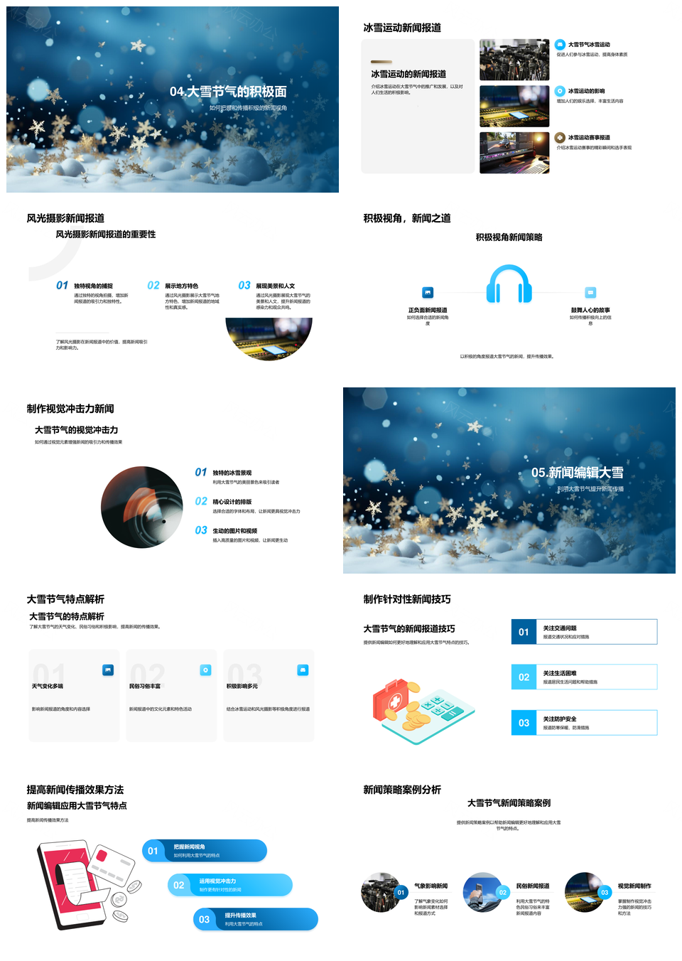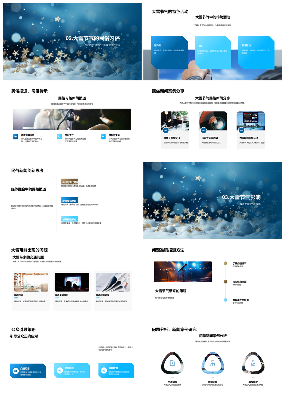 这是一张大雪节气新闻解读天气民俗传统报道PPT模板,包含大雪节气、新闻解读、天气、民俗、传统、报道等主题内容,也可用作大雪节气新闻解读天气民俗传统报道、大雪节气天气民俗传统、大雪节气新闻解读天气、大雪节气民俗传统报道、大雪节气新闻解读民俗、节气新闻解读天气民俗、大雪节气天气民俗、新闻解读天气民俗传统、节气天气民俗传统、大雪节气新闻解读、大雪节气民俗传统、新闻解读民俗传统、大雪节气天气、节气民俗传统、天气民俗传统等PPT场景使用。