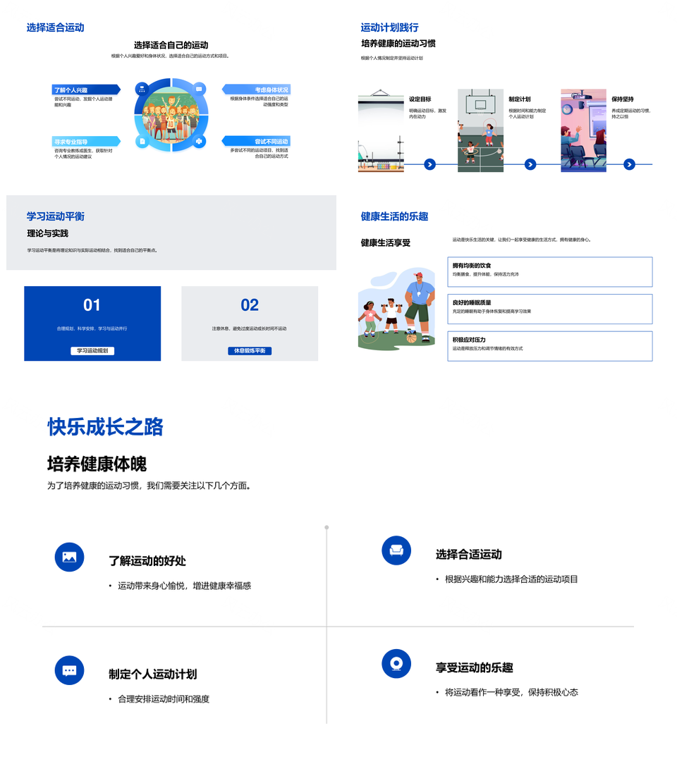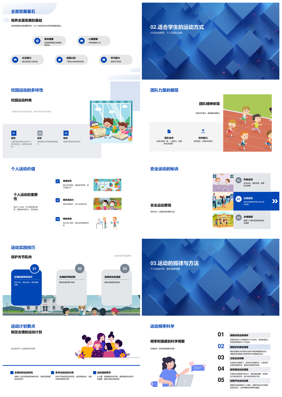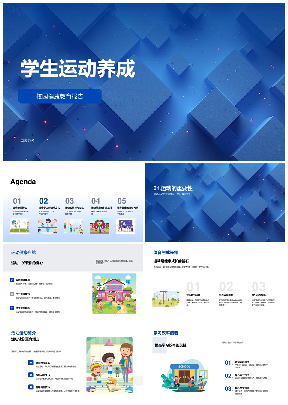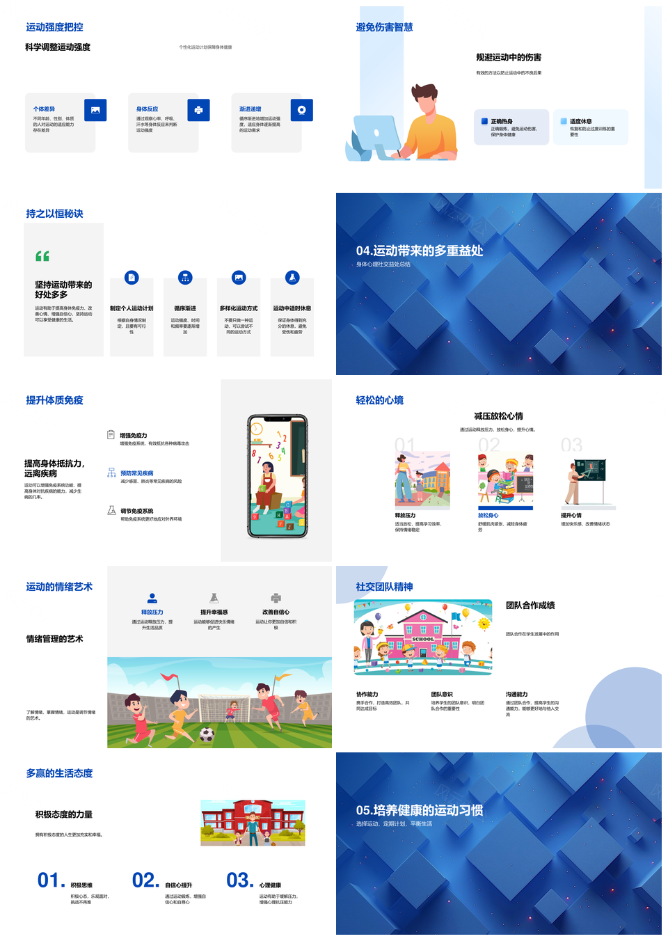 这是一张学生运动养成促进校园健康提升学习效率PPT模板,包含学生、运动、养成、促进、校园、健康、提升、学习效率等主题内容,也可用作学生运动促进健康提升、运动养成促进校园健康、促进校园健康提升学习、校园健康提升学习效率、学生运动促进健康、运动促进校园健康、健康提升学习效率、促进健康提升效率、运动养成促进健康、校园健康提升学习、学生运动养成、促进校园健康、健康提升学习、运动促进健康、提升学习效率等PPT场景使用。 风云办公提供的学生运动养成促进校园健康提升学习效率PPT模板,下载格式为pptx,一共33页,作品中文字及图均可以修改和编辑,图片更改请在作品中右键图片并更换,文字修改请直接点击文字进行修改。