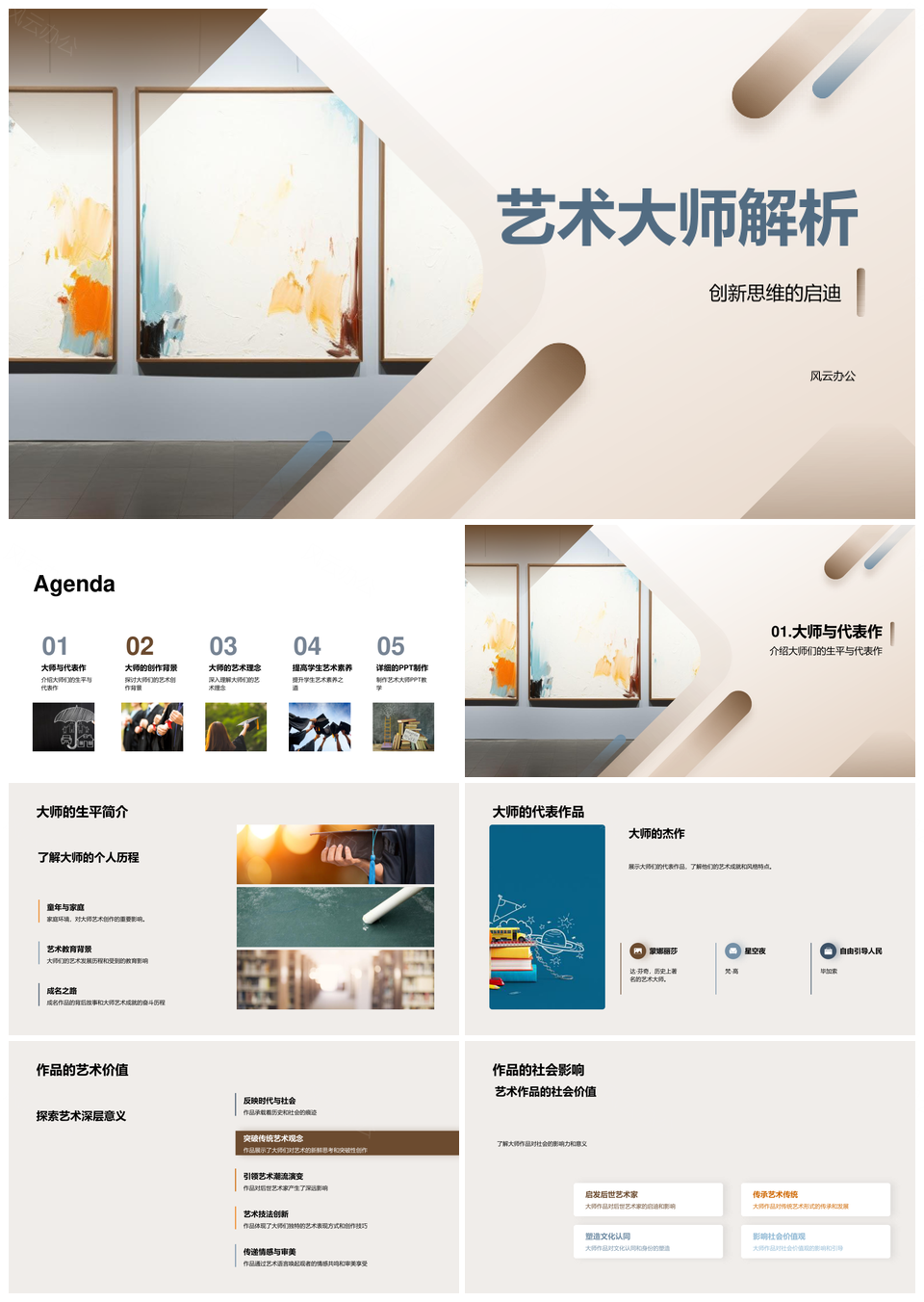 风云办公提供的艺术大师创新思维美术史艺术价值解析PPT模板,下载格式为pptx,一共24页,作品中文字及图均可以修改和编辑,图片更改请在作品中右键图片并更换,文字修改请直接点击文字进行修改。
