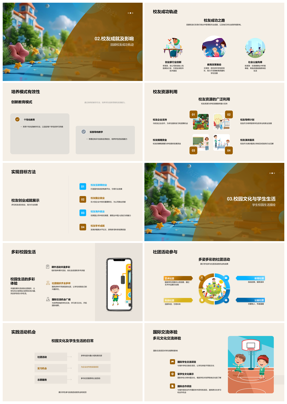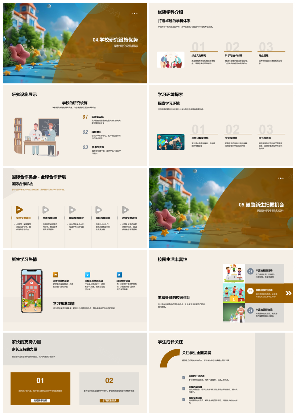 学校发展教育理念多元教学校友成就国际研究校园生活PPT模板推荐