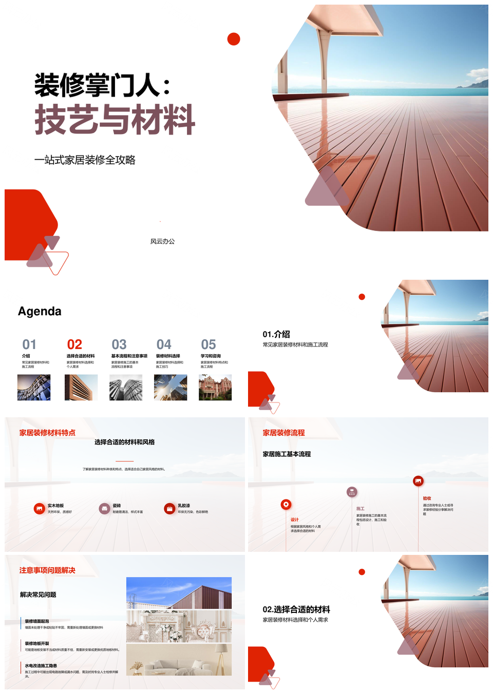 风云办公提供的家居装修材料施工技巧与工艺解析PPT模板,下载格式为pptx,一共24页,作品中文字及图均可以修改和编辑,图片更改请在作品中右键图片并更换,文字修改请直接点击文字进行修改。