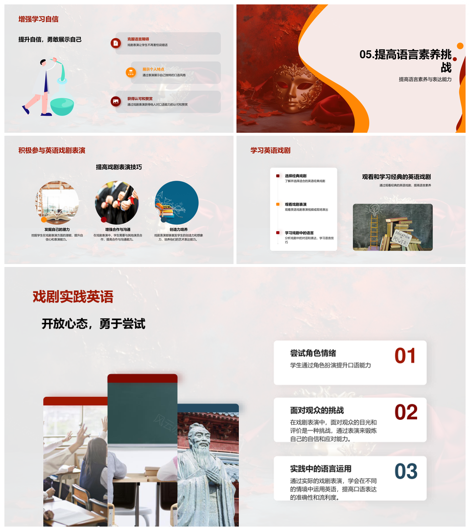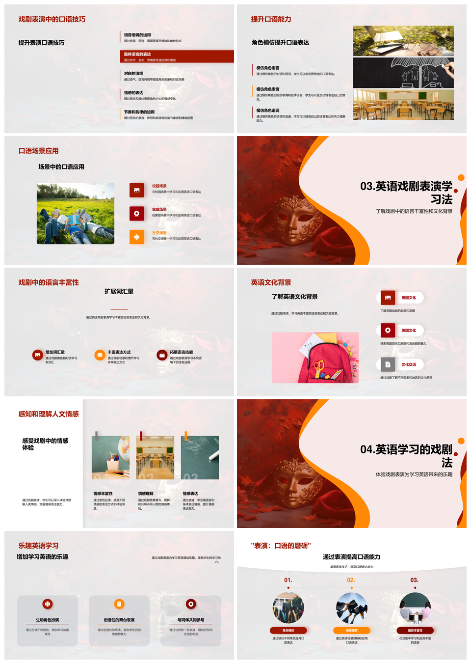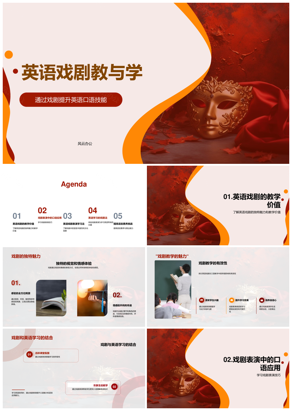 风云办公提供的英语戏剧教学有效性口语文化面具PPT模板,下载格式为pptx,一共23页,作品中文字及图均可以修改和编辑,图片更改请在作品中右键图片并更换,文字修改请直接点击文字进行修改。