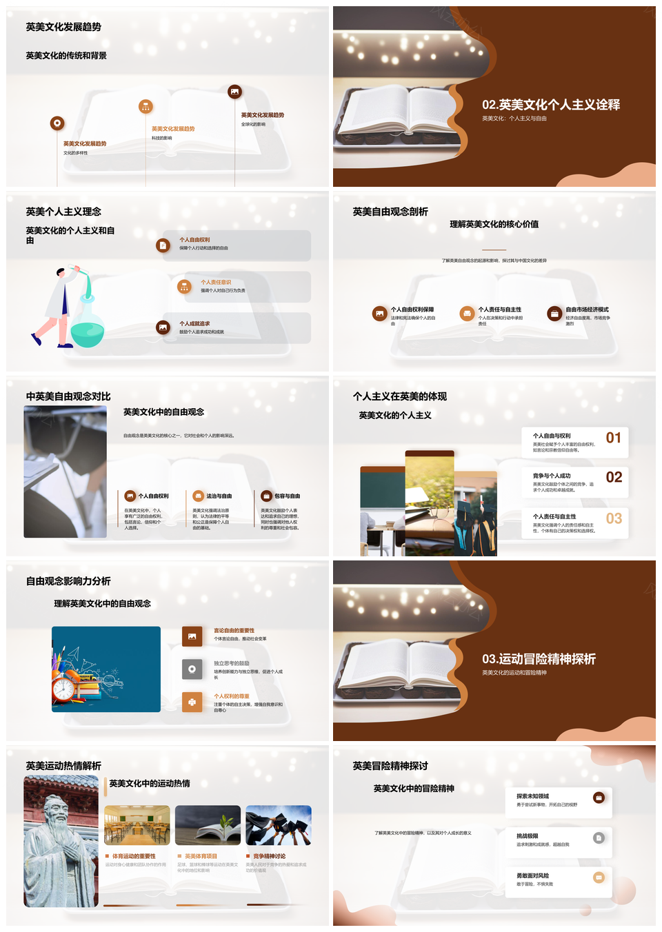 风云办公提供的英美文化自由冒险精神英语习语解码PPT模板,下载格式为pptx,一共33页,作品中文字及图均可以修改和编辑,图片更改请在作品中右键图片并更换,文字修改请直接点击文字进行修改。
