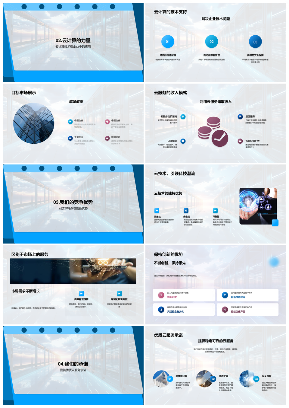 这是一张云计算领航企业技术覆盖市场创新领先发展PPT模板,包含云计算、领航企业、技术、覆盖、市场、创新、领先、发展等主题内容,也可用作云计算领航企业技术覆盖、领航企业技术覆盖市场、企业技术覆盖市场创新、技术覆盖市场创新领先、覆盖市场创新领先发展、云计算领航企业技术、领航企业技术覆盖、企业技术覆盖市场、技术覆盖市场创新、覆盖市场创新领先、市场创新领先发展、云计算领航企业、领航企业技术、企业技术覆盖、技术覆盖市场、覆盖市场创新、市场创新领先、创新领先发展等PPT场景使用。 风云办公提供的云计算领航企业技术覆盖市场创新领先发展PPT模板,下载格式为pptx,一共24页,作品中文字及图均可以修改和编辑,图片更改请在作品中右键图片并更换,文字修改请直接点击文字进行修改。
