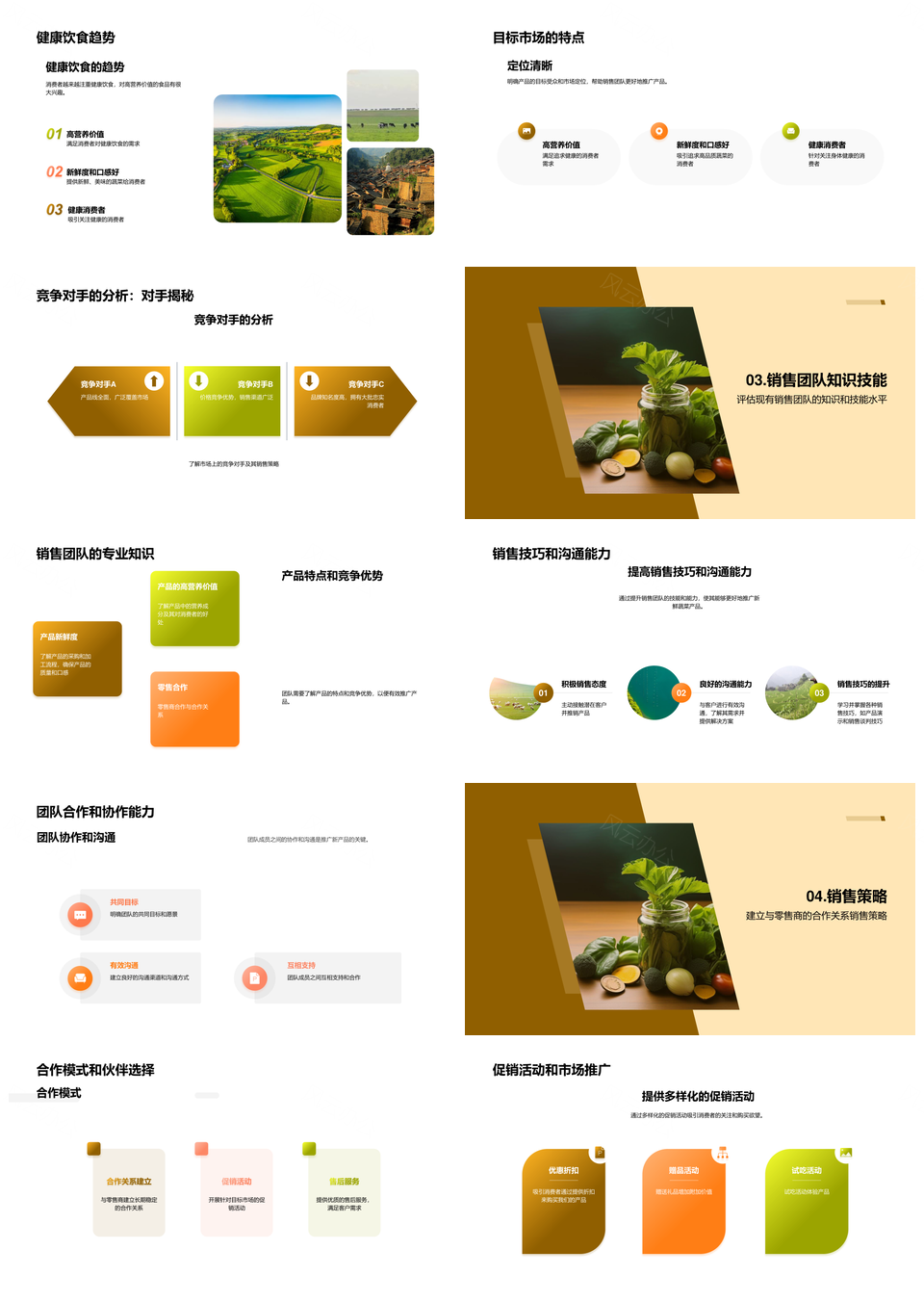 这是一张新鲜蔬菜产品营销推广策略与竞争优势分析PPT模板,包含新鲜蔬菜、产品、营销、推广、策略、与、竞争、优势、分析等主题内容,也可用作新鲜蔬菜产品营销推广策略、产品营销推广策略分析、新鲜蔬菜产品竞争优势分析、产品营销推广竞争优势分析、营销推广策略竞争优势分析、新鲜蔬菜营销推广策略分析、新鲜蔬菜产品营销推广、产品竞争优势策略分析、营销推广策略分析、产品营销推广策略、竞争优势分析、新鲜蔬菜竞争优势、策略分析、新鲜蔬菜产品、产品分析等PPT场景使用。 风云办公提供的新鲜蔬菜产品营销推广策略与竞争优势分析PPT模板,下载格式为pptx,一共27页,作品中文字及图均可以修改和编辑,图片更改请在作品中右键图片并更换,文字修改请直接点击文字进行修改。