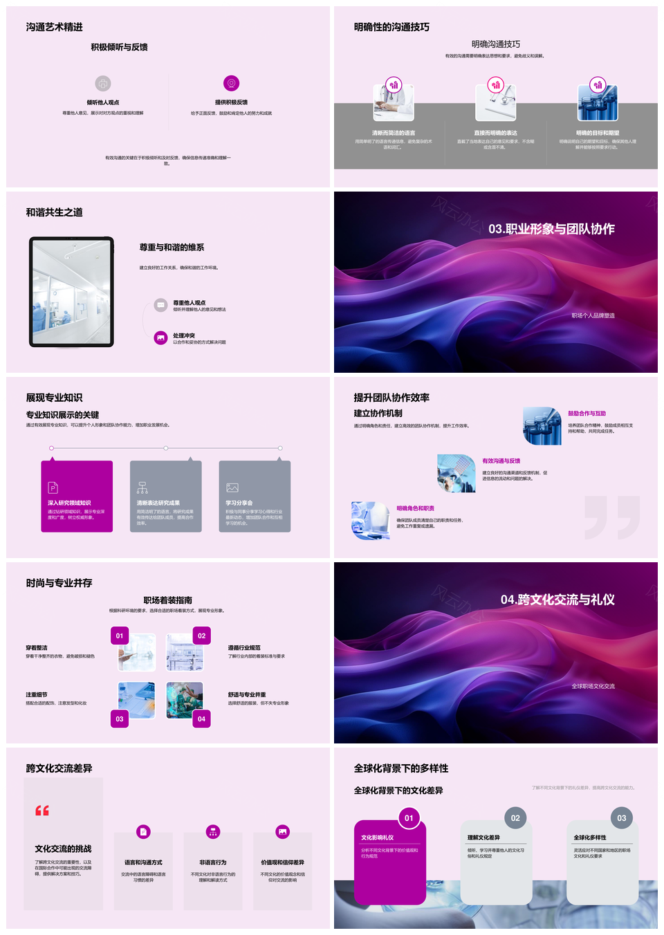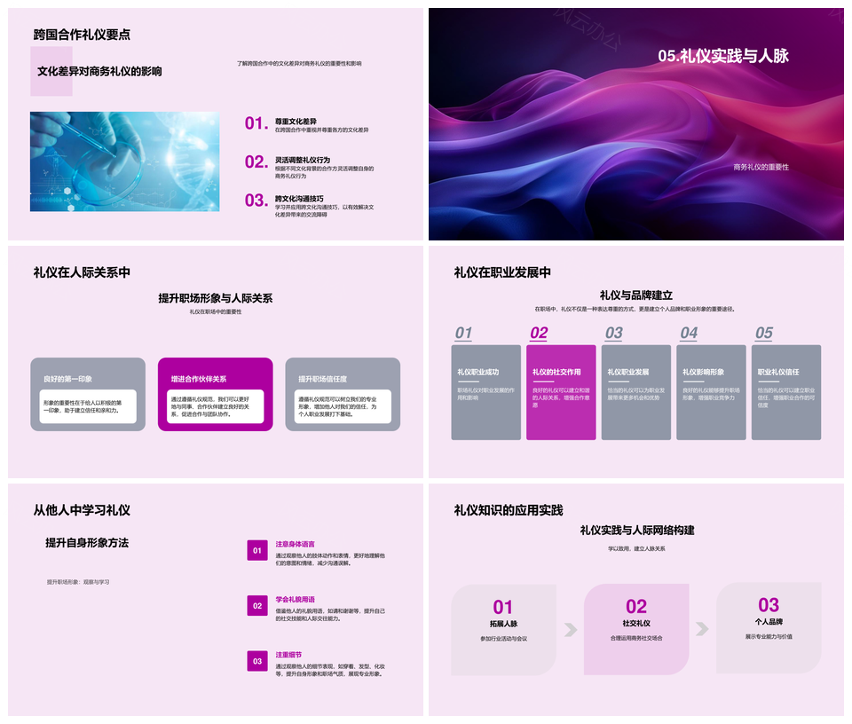 这是一张生物医药商务礼仪与跨文化职场合作指南PPT模板,包含生物医药、商务礼仪、跨文化、职场合作、指南等主题内容,也可用作生物医药商务礼仪、商务礼仪跨文化职场、跨文化职场合作指南、医药商务礼仪、商务礼仪跨文化、跨文化职场合作、职场合作指南、生物医药合作、商务合作指南、商务礼仪指南、生物医药、医药商务、商务礼仪、跨文化职场、职场合作等PPT场景使用。 风云办公提供的生物医药商务礼仪与跨文化职场合作指南PPT模板,下载格式为pptx,一共24页,作品中文字及图均可以修改和编辑,图片更改请在作品中右键图片并更换,文字修改请直接点击文字进行修改。