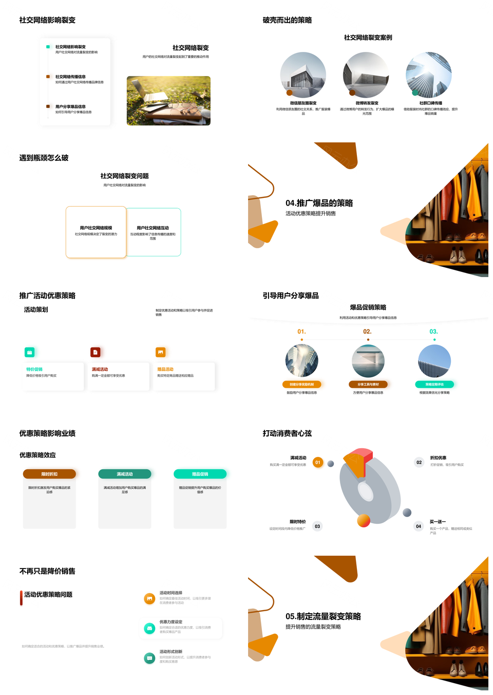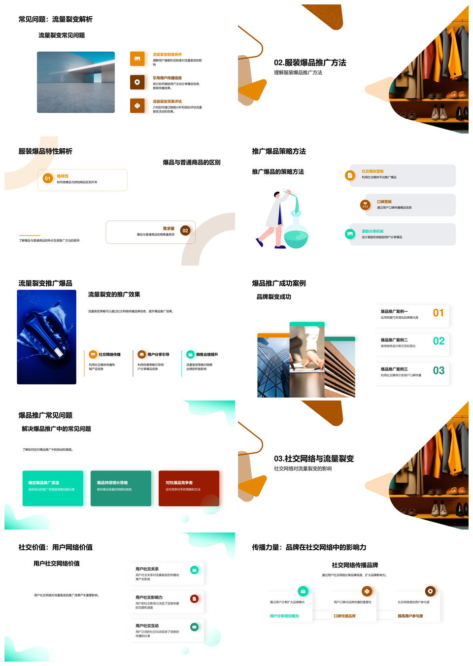 这是一张裂变营销爆品推广社交电商服装销量引爆PPT模板,包含裂变营销、爆品推广、社交电商、服装销量、引爆等主题内容,也可用作裂变营销爆品推广社交电商、社交电商服装销量引爆、裂变营销爆品推广服装销量、爆品推广社交电商服装销量、裂变营销社交电商服装销量、社交电商服装销量引爆裂变、裂变营销推广社交电商服装、爆品推广社交电商服装、裂变营销爆品推广、爆品推广社交电商、社交电商服装销量、裂变营销社交电商、服装销量引爆、爆品推广、销量引爆等PPT场景使用。 风云办公提供的裂变营销爆品推广社交电商服装销量引爆PPT模板,下载格式为pptx,一共33页,作品中文字及图均可以修改和编辑,图片更改请在作品中右键图片并更换,文字修改请直接点击文字进行修改。