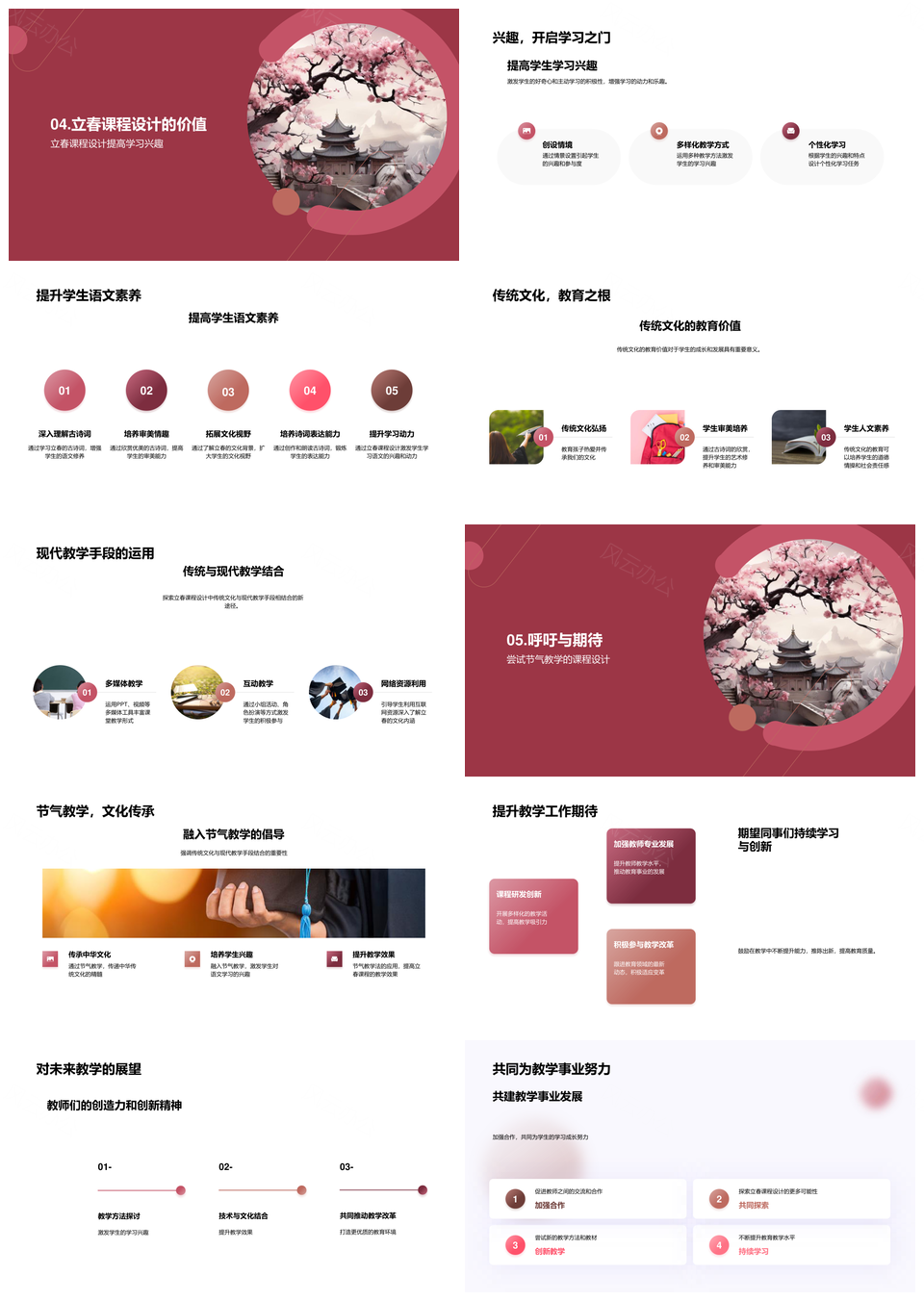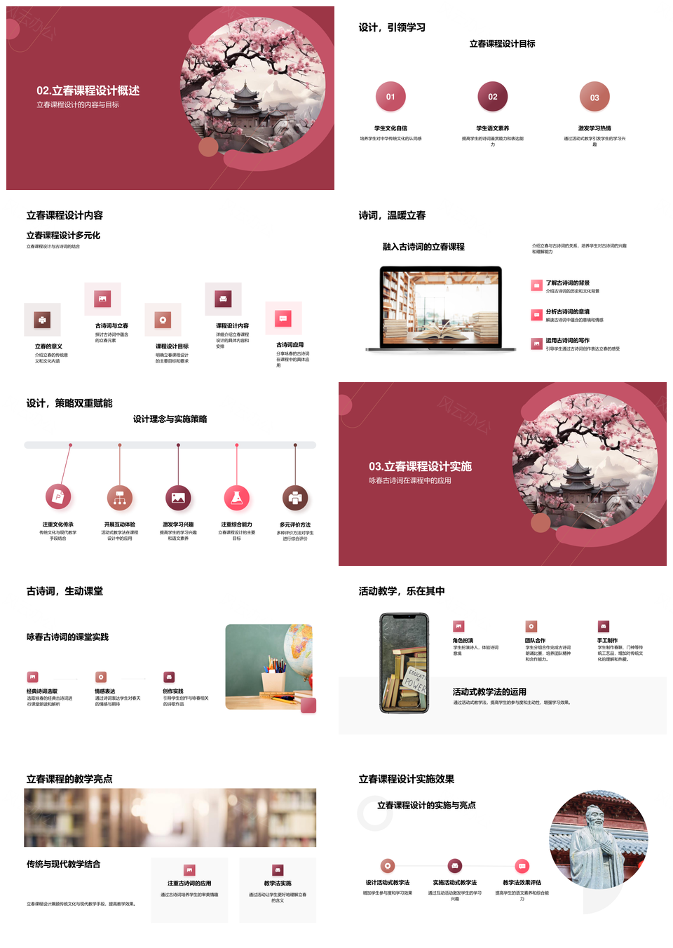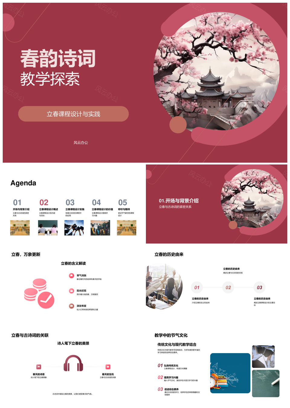 风云办公提供的春韵诗词活动教学立春咏春樱研发展PPT模板,下载格式为pptx,一共28页,作品中文字及图均可以修改和编辑,图片更改请在作品中右键图片并更换,文字修改请直接点击文字进行修改。