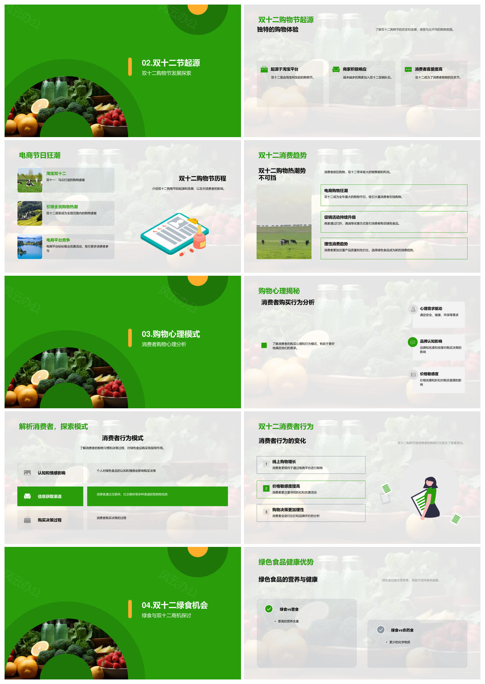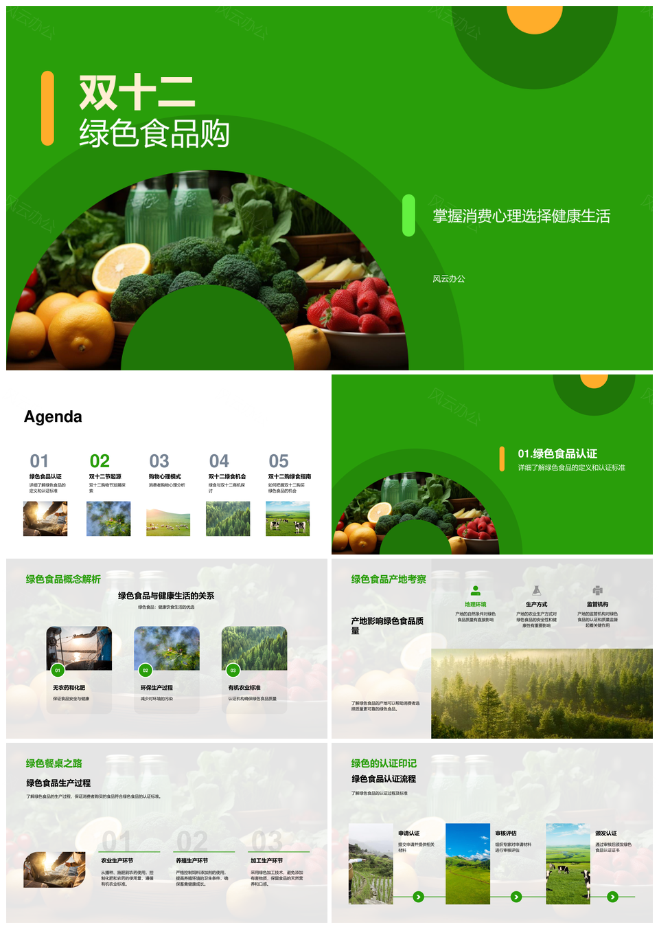风云办公提供的双十二绿色食品健康生活购物节PPT模板,下载格式为pptx,一共25页,作品中文字及图均可以修改和编辑,图片更改请在作品中右键图片并更换,文字修改请直接点击文字进行修改。