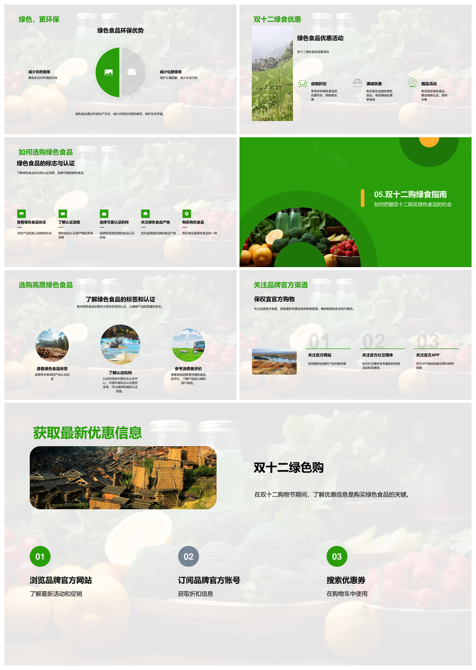 这是一张双十二绿色食品健康生活购物节PPT模板,包含双十二、绿色食品、健康生活、购物节等主题内容,也可用作双十二绿色食品健康生活购物节、双十二绿色食品健康生活、双十二绿色食品购物节、双十二健康生活购物节、绿色食品健康生活购物节、双十二绿色食品、双十二健康生活、双十二购物节、绿色食品健康生活、绿色食品购物节、健康生活购物节等PPT场景使用。