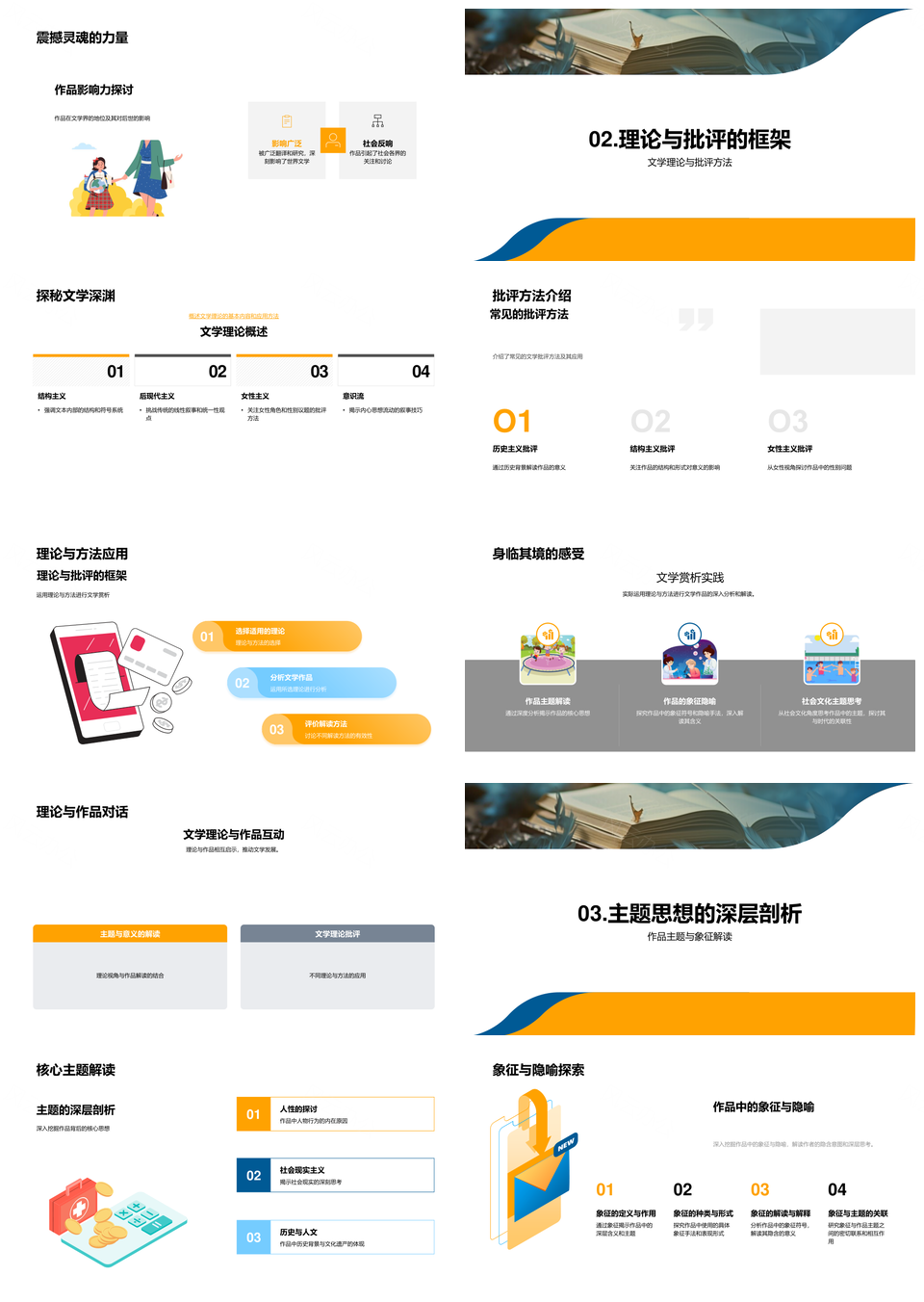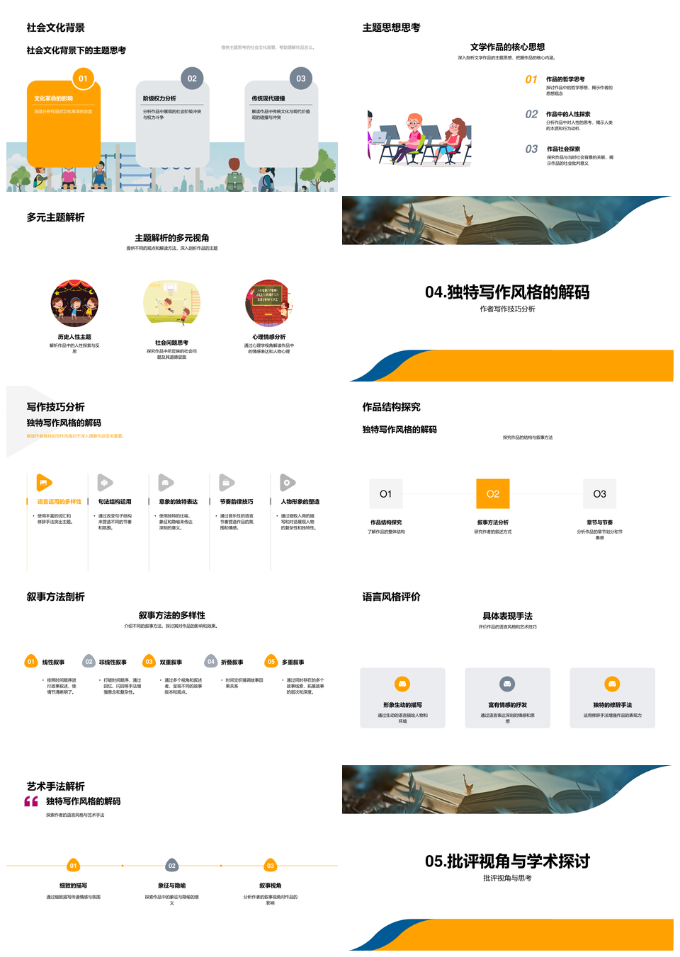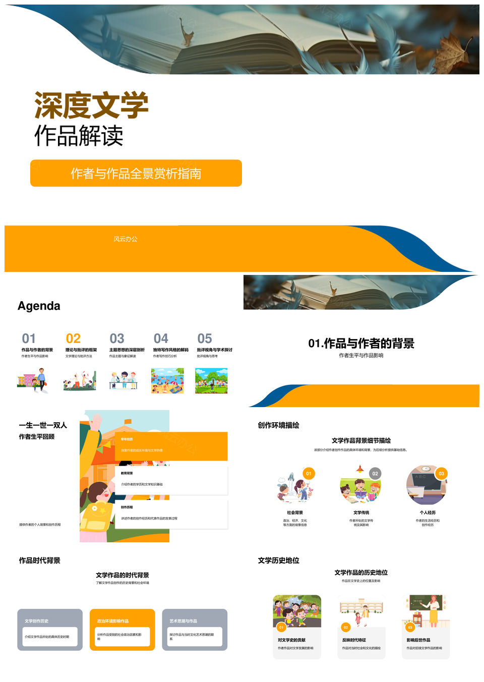 风云办公提供的文学作品多维解析理论与背景主题赏析PPT模板,下载格式为pptx,一共33页,作品中文字及图均可以修改和编辑,图片更改请在作品中右键图片并更换,文字修改请直接点击文字进行修改。