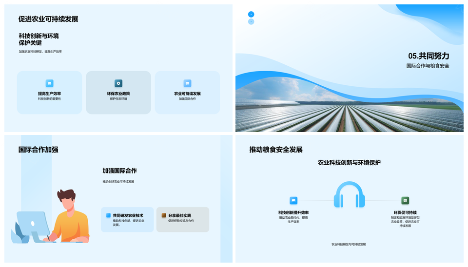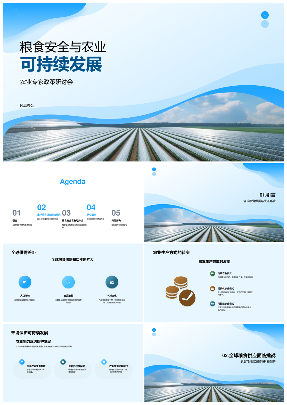 这是一张粮食安全与农业可持续发展应对全球挑战PPT模板,包含粮食安全、农业可持续发展、全球挑战等主题内容,也可用作粮食安全农业可持续发展应对、农业可持续发展应对全球挑战、粮食安全农业可持续发展、农业可持续发展应对、可持续发展应对全球挑战、粮食安全应对全球挑战、农业可持续发展全球挑战、应对全球挑战、农业可持续发展、粮食安全可持续发展应对、粮食安全可持续发展、可持续发展全球挑战、粮食安全农业、可持续发展应对、粮食安全应对等PPT场景使用。 风云办公提供的粮食安全与农业可持续发展应对全球挑战PPT模板,下载格式为pptx,一共22页,作品中文字及图均可以修改和编辑,图片更改请在作品中右键图片并更换,文字修改请直接点击文字进行修改。