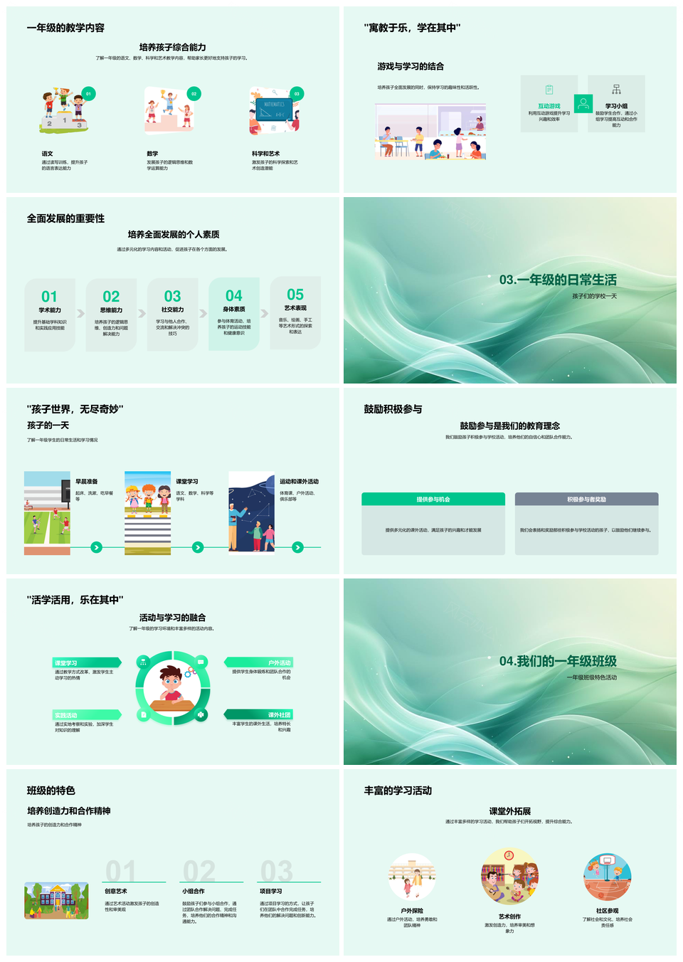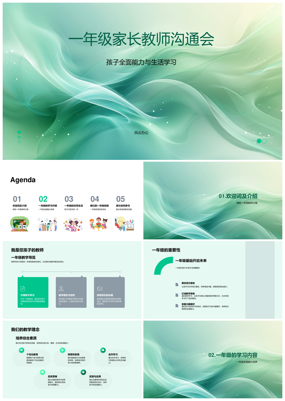 风云办公提供的家校共育一年级教学全面成长学玩平衡PPT模板,下载格式为pptx,一共23页,作品中文字及图均可以修改和编辑,图片更改请在作品中右键图片并更换,文字修改请直接点击文字进行修改。