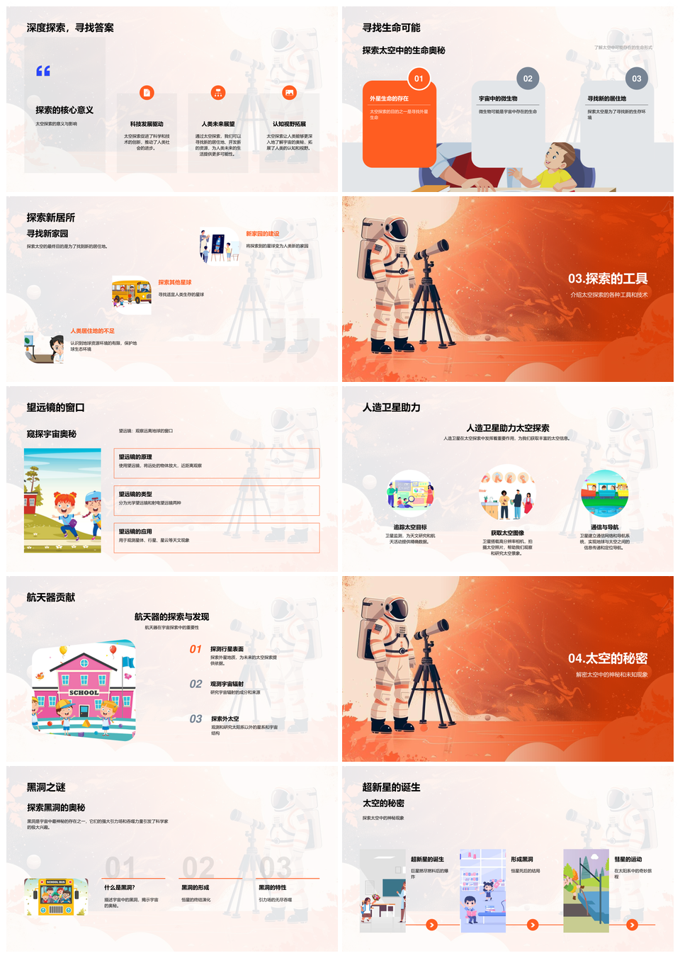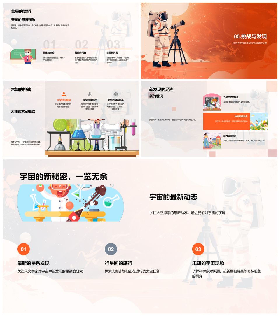 这是一张太空探索知识PPT模板,包含太空探索、知识等主题内容,也可用作太空探索知识、太空探索、探索知识、太空知识等PPT场景使用。 风云办公提供的太空探索知识PPT模板,下载格式为pptx,一共23页,作品中文字及图均可以修改和编辑,图片更改请在作品中右键图片并更换,文字修改请直接点击文字进行修改。